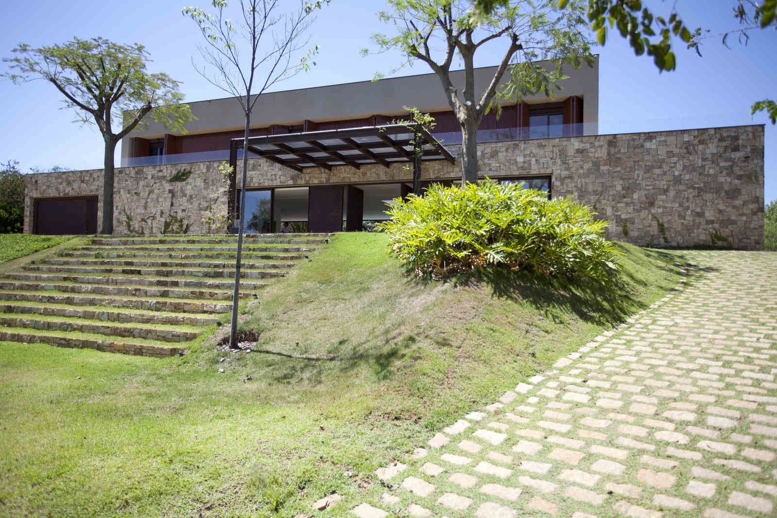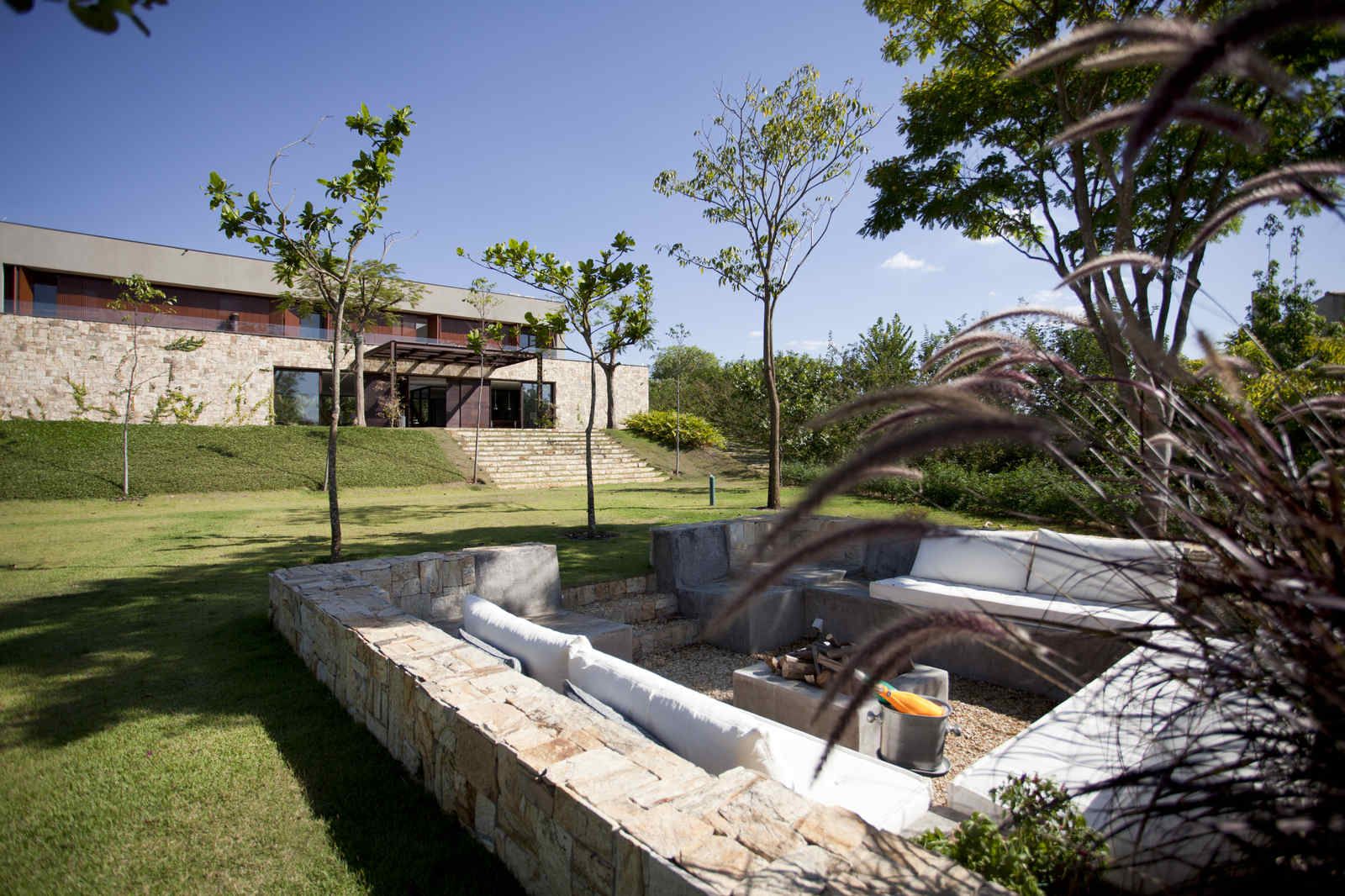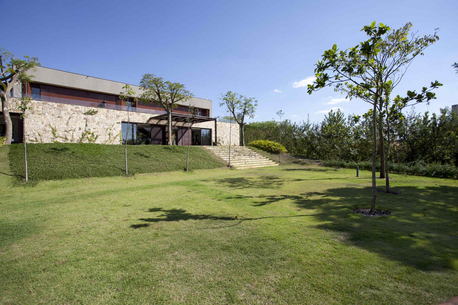 “Mesmo com mais de três mil m², o lote não era fácil de resolver. Além da insolação um pouco prejudicada, ele começava estreito e se abria para os fundos numa subida. Sendo assim, resolvemos posicionar a residência atrás, nessa parte mais alta, o que dispensou grandes movimentações de terra e garantiu uma bela vista.”