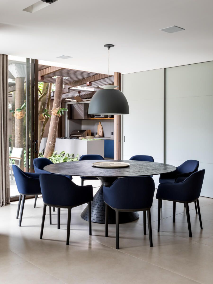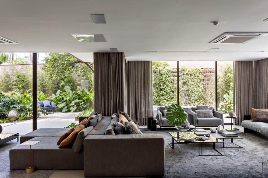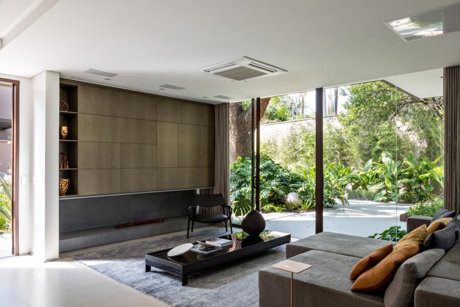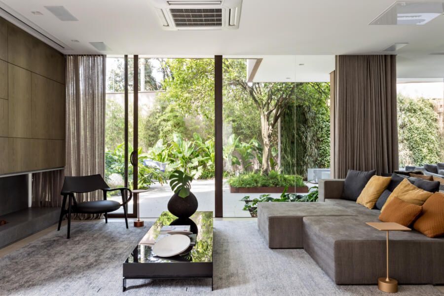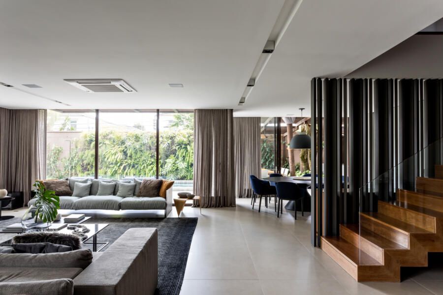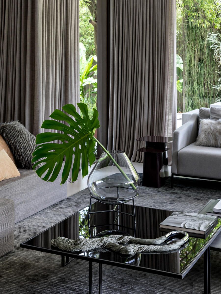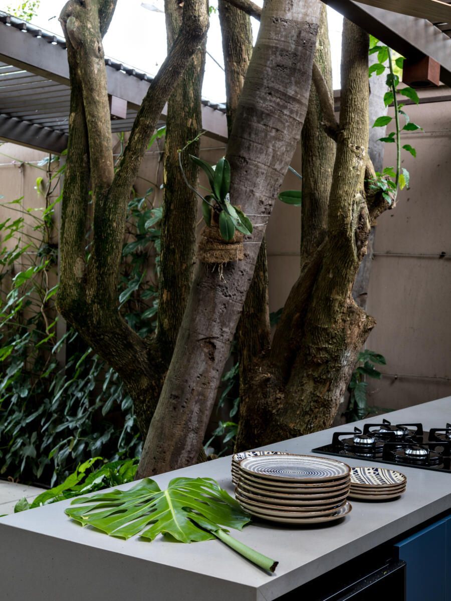 “A ideia foi tornar o jardim uma extensão da área de convivência da família e amigos. Para esse desafio, convidamos o paisagista Alex Hanazaki, e juntos projetamos a integração da área interna com a externa através da equalização do piso de porcelanato. Grandes panos de vidro margeiam o andar térreo, permitindo assim que as plantas também invadam a casa.”