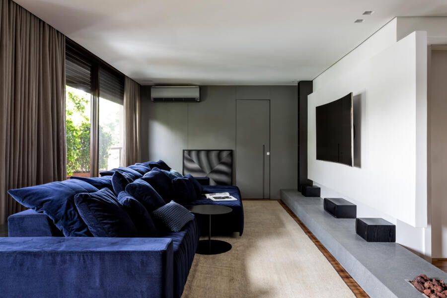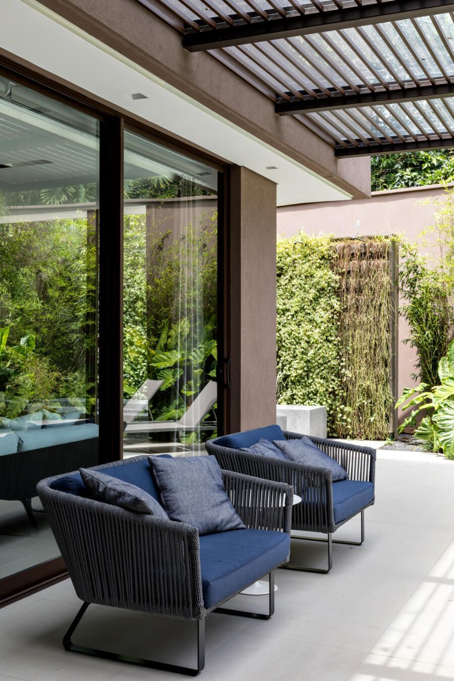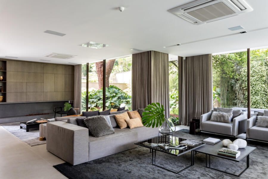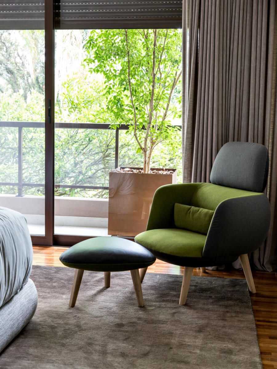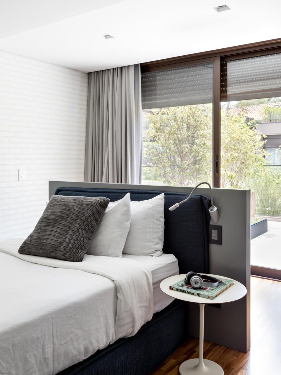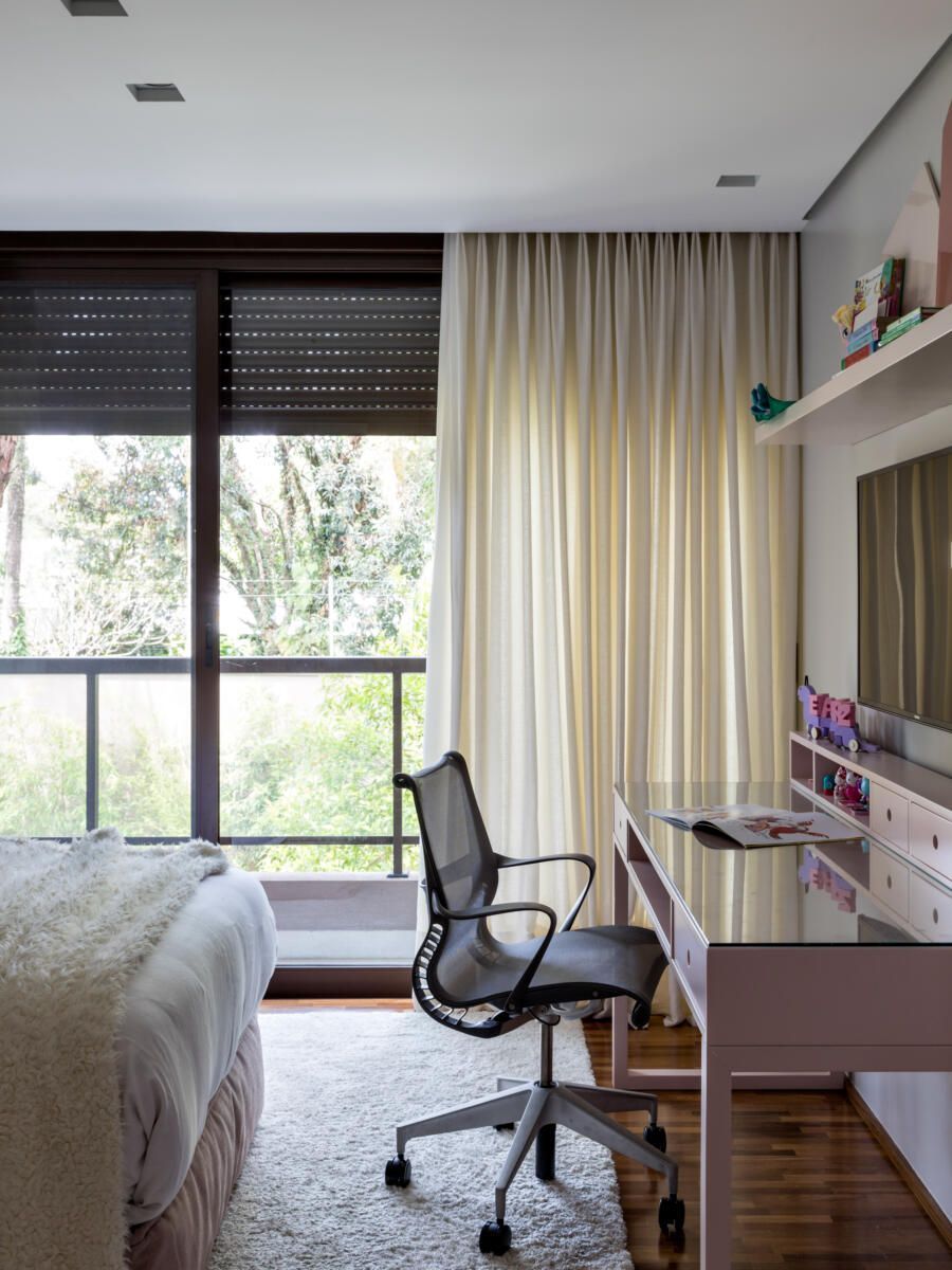 “A ideia foi tornar o jardim uma extensão da área de convivência da família e amigos. Para esse desafio, convidamos o paisagista Alex Hanazaki, e juntos projetamos a integração da área interna com a externa através da equalização do piso de porcelanato. Grandes panos de vidro margeiam o andar térreo, permitindo assim que as plantas também invadam a casa.”