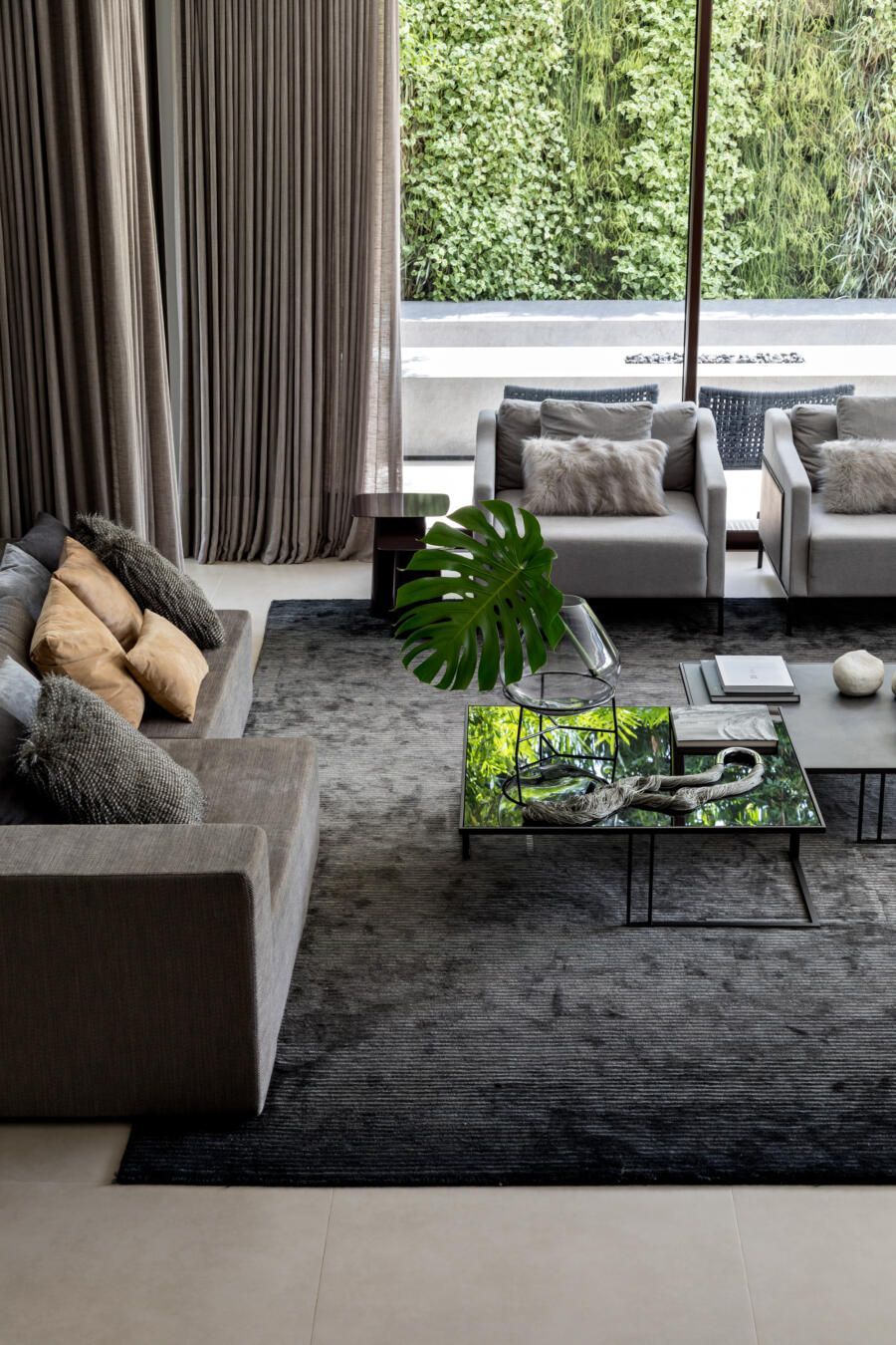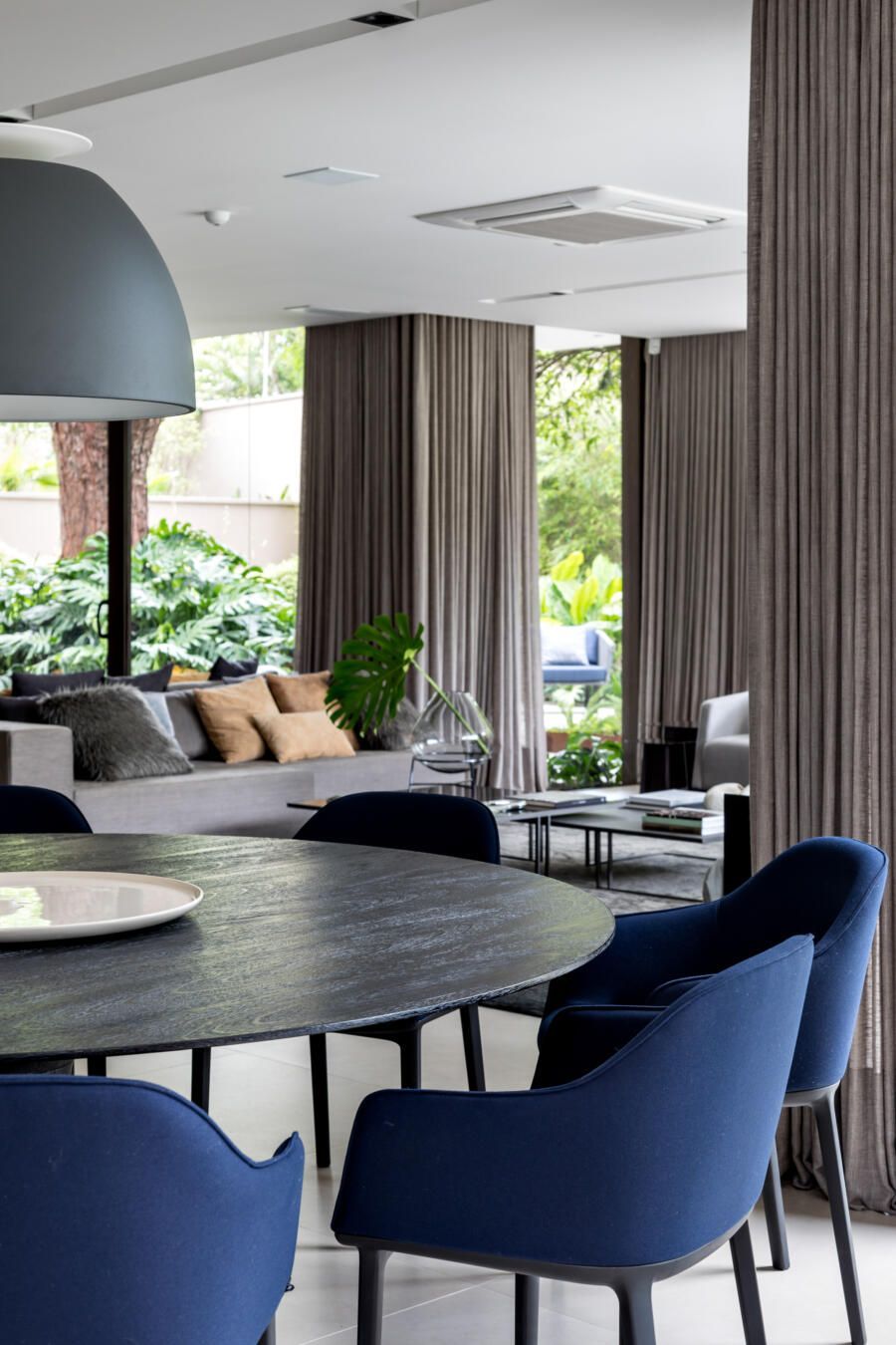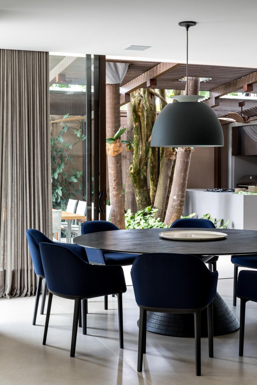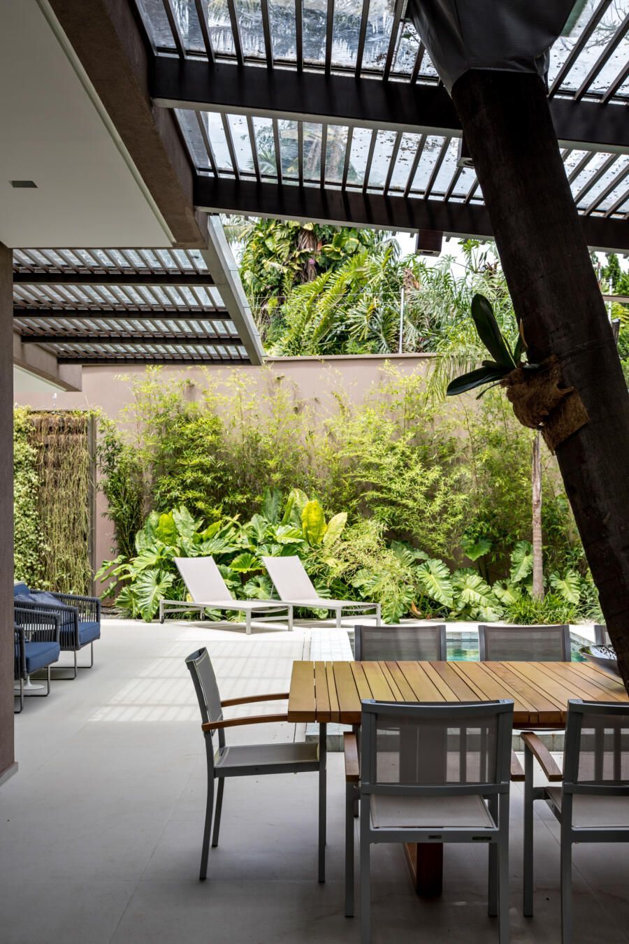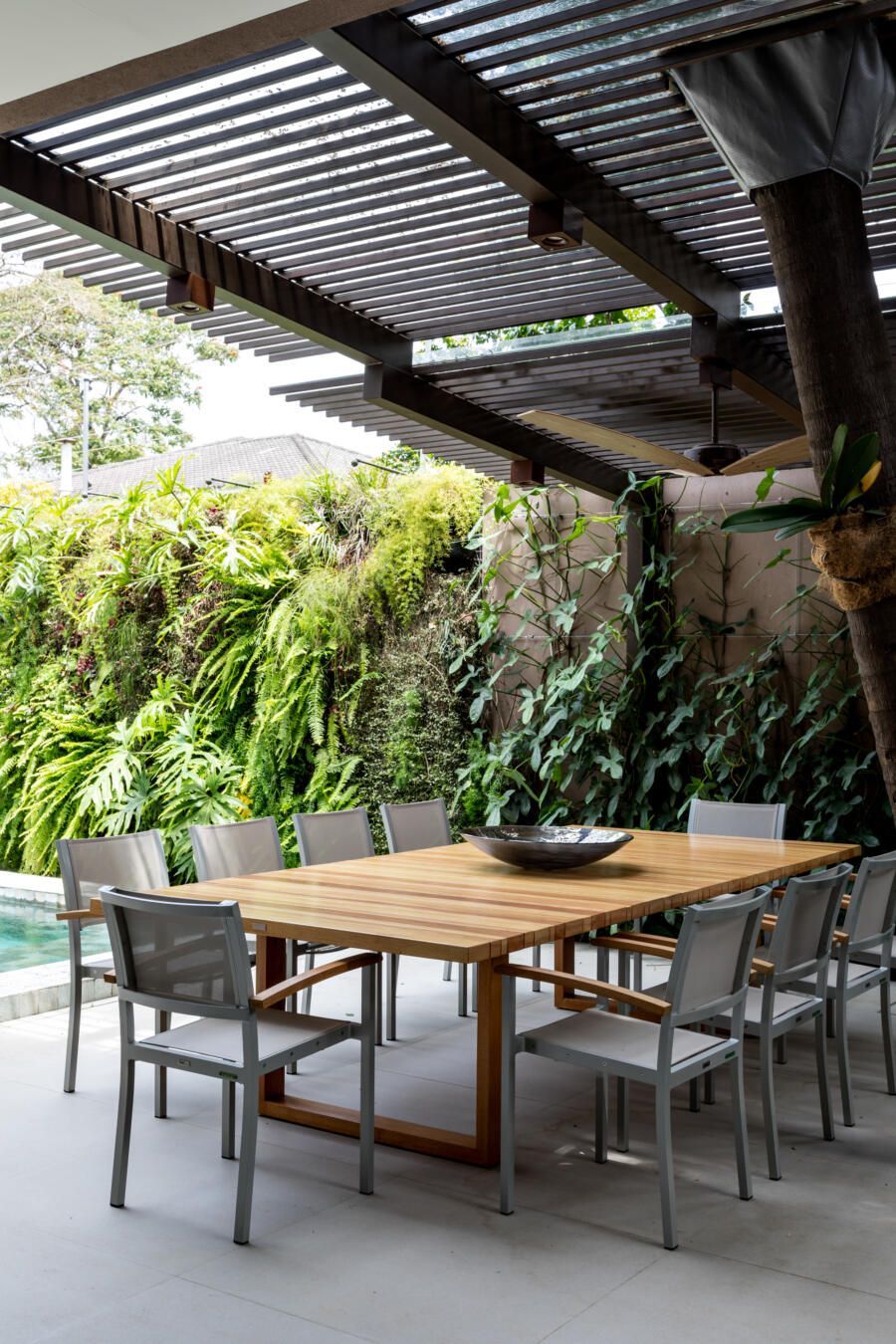 “A ideia foi tornar o jardim uma extensão da área de convivência da família e amigos. Para esse desafio, convidamos o paisagista Alex Hanazaki, e juntos projetamos a integração da área interna com a externa através da equalização do piso de porcelanato. Grandes panos de vidro margeiam o andar térreo, permitindo assim que as plantas também invadam a casa.”