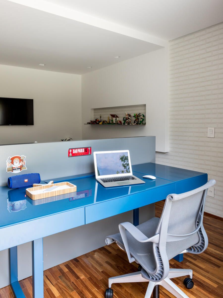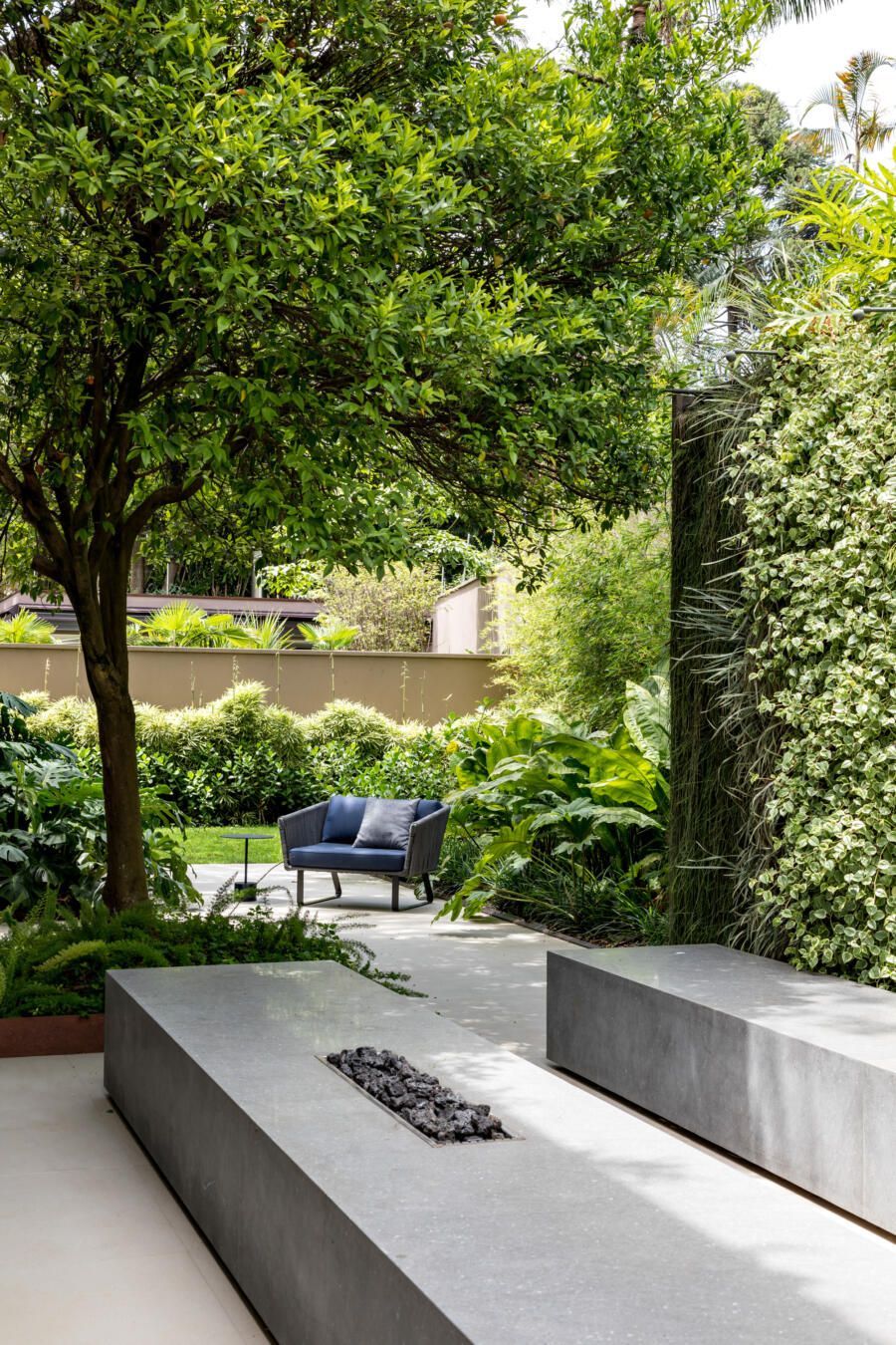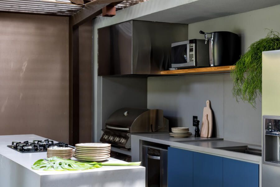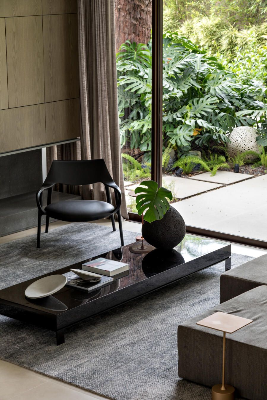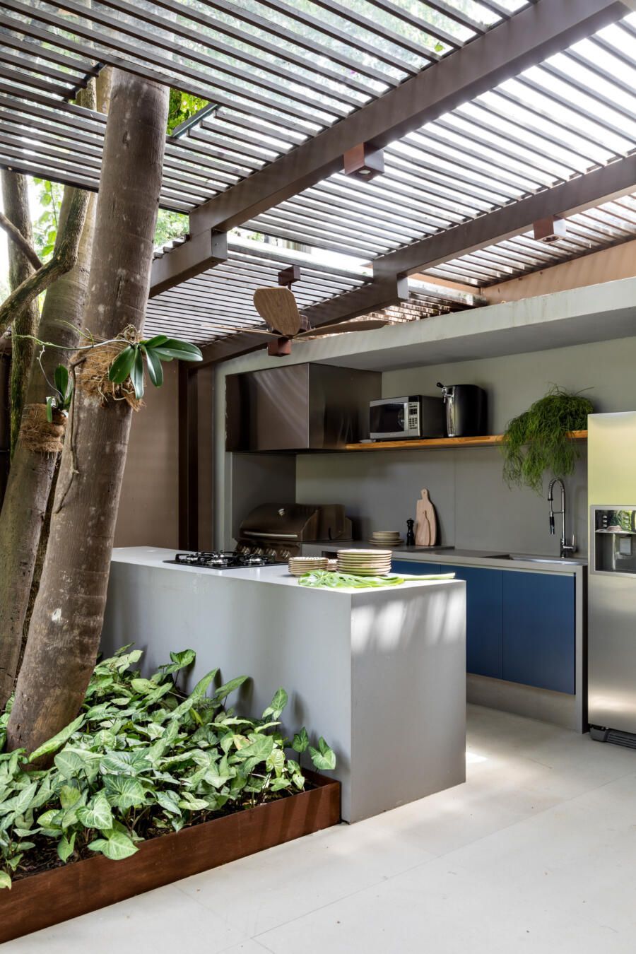 “A ideia foi tornar o jardim uma extensão da área de convivência da família e amigos. Para esse desafio, convidamos o paisagista Alex Hanazaki, e juntos projetamos a integração da área interna com a externa através da equalização do piso de porcelanato. Grandes panos de vidro margeiam o andar térreo, permitindo assim que as plantas também invadam a casa.”