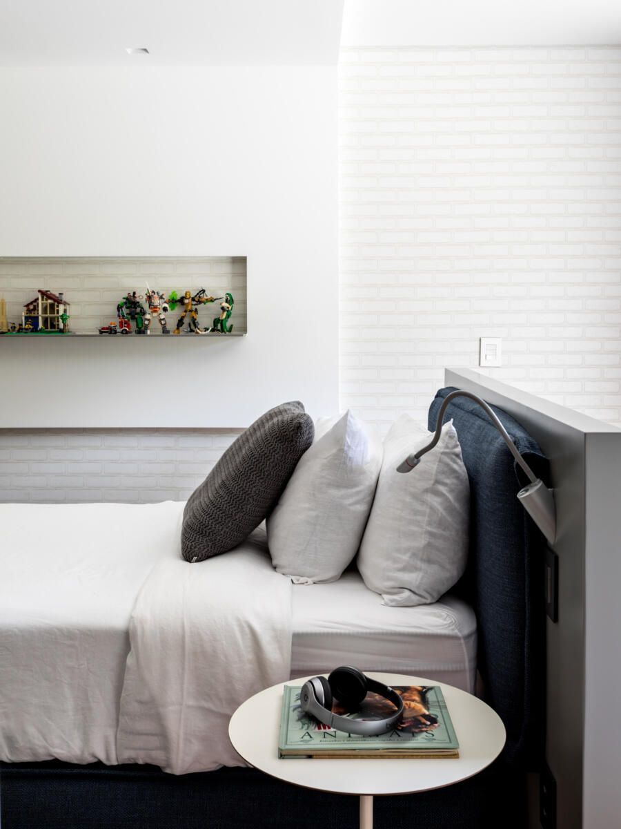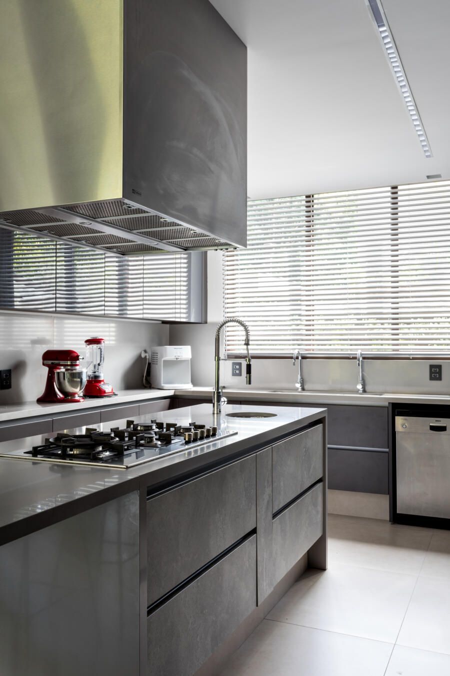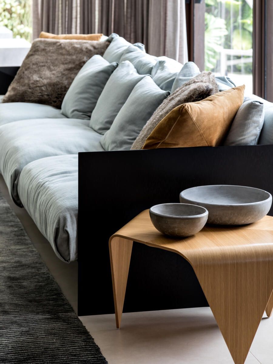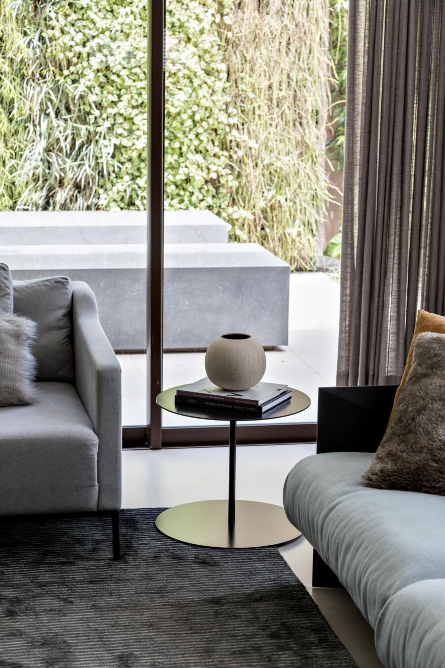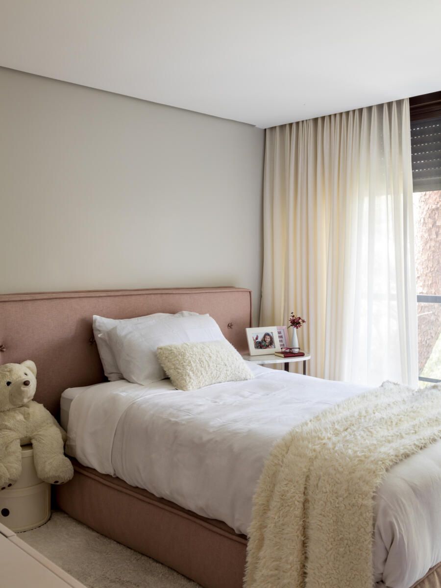 “A ideia foi tornar o jardim uma extensão da área de convivência da família e amigos. Para esse desafio, convidamos o paisagista Alex Hanazaki, e juntos projetamos a integração da área interna com a externa através da equalização do piso de porcelanato. Grandes panos de vidro margeiam o andar térreo, permitindo assim que as plantas também invadam a casa.”