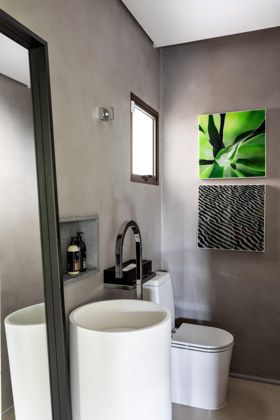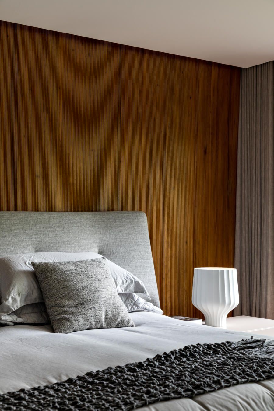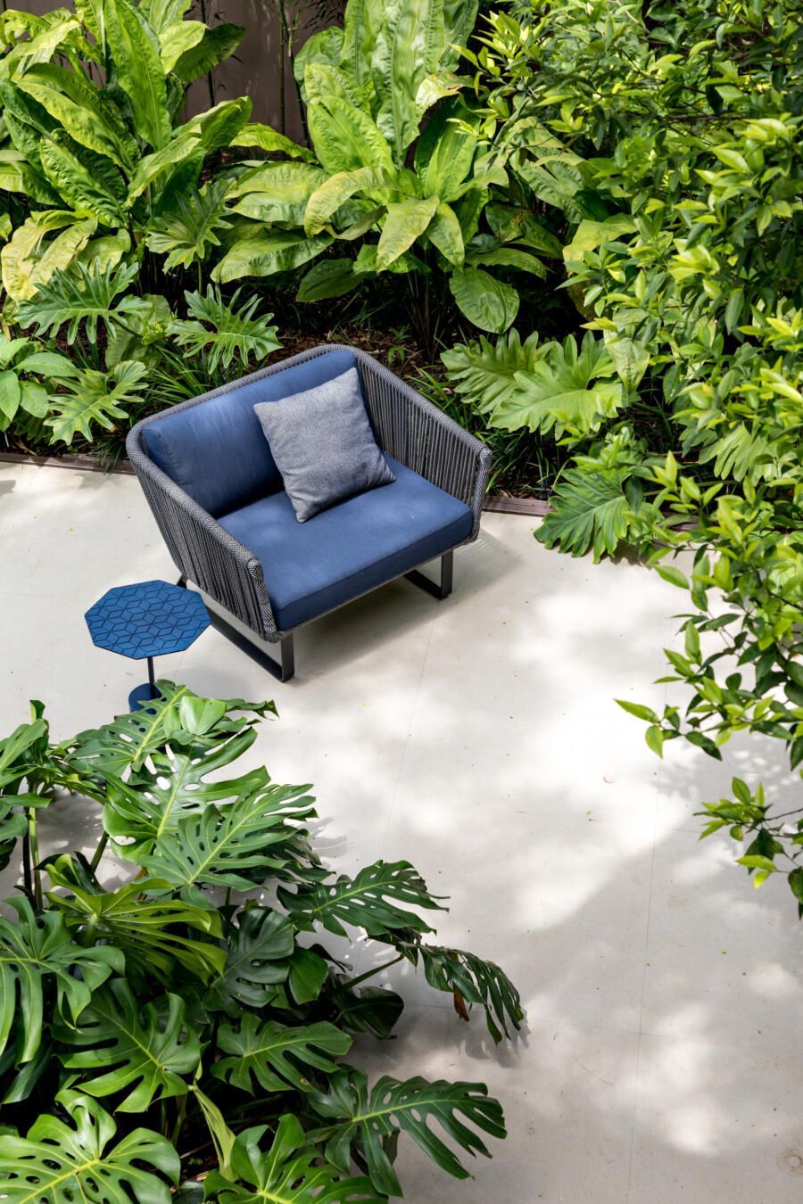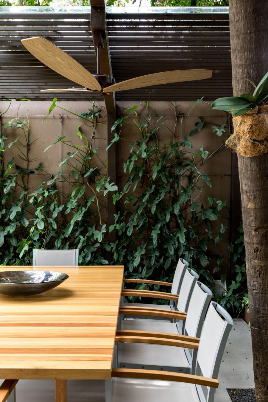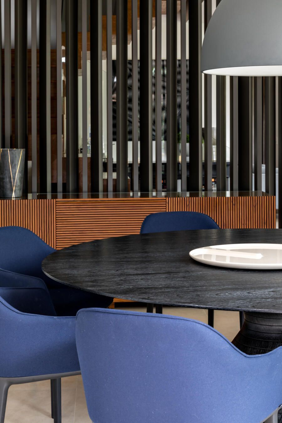 “A ideia foi tornar o jardim uma extensão da área de convivência da família e amigos. Para esse desafio, convidamos o paisagista Alex Hanazaki, e juntos projetamos a integração da área interna com a externa através da equalização do piso de porcelanato. Grandes panos de vidro margeiam o andar térreo, permitindo assim que as plantas também invadam a casa.”