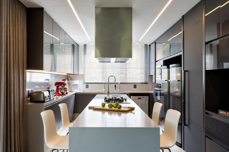 Admiradores do design contemporâneo, o casal desejava uma casa que fosse prática para o dia a dia, mas sem deixar de lado toques de elegância e modernidade, e claro, muito verde para combinar com o bairro.