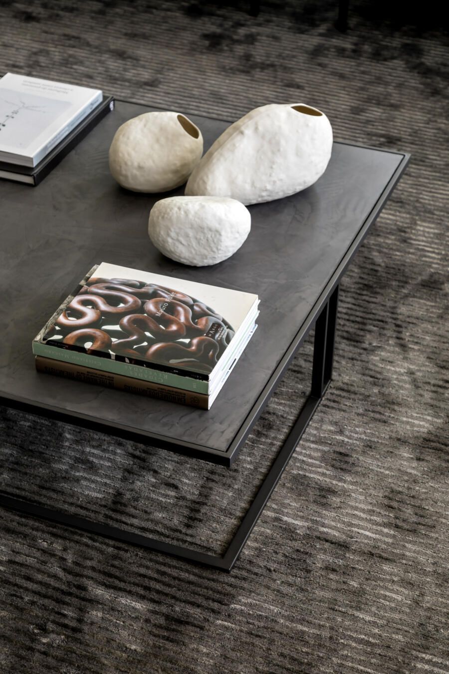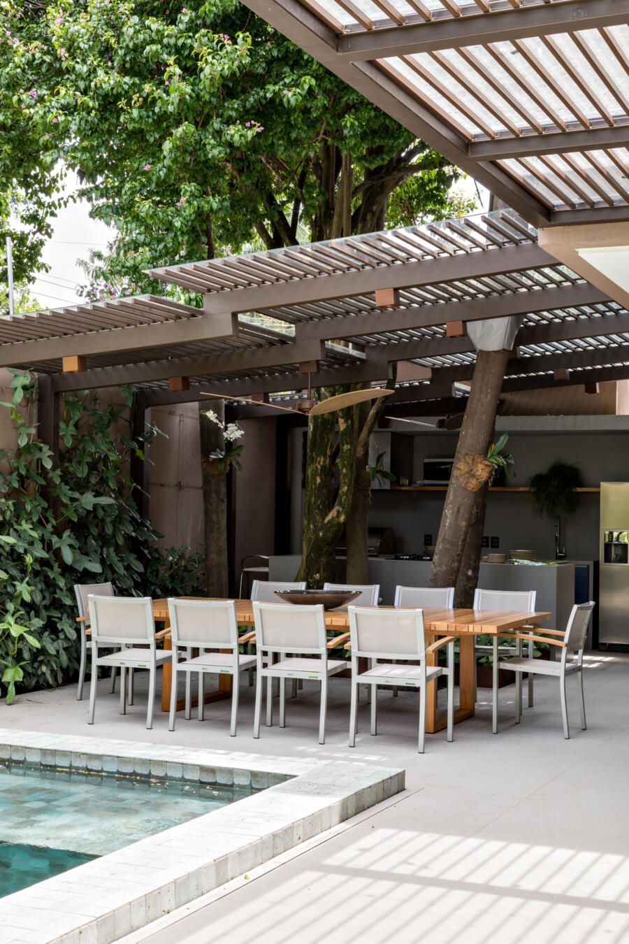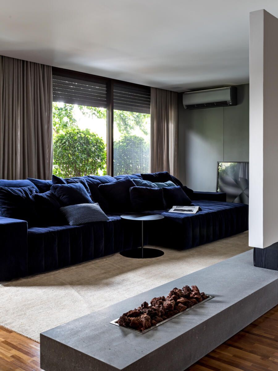 “A piscina já existente foi revestida em pedra vulcânica, dando um ar mais moderno. O campinho de futebol foi um pedido do filho mais novo, sendo algo funcional que não compromete o visual geral.”