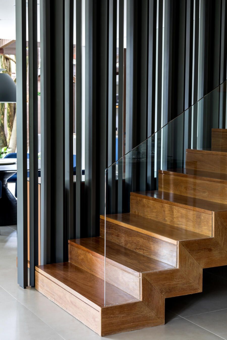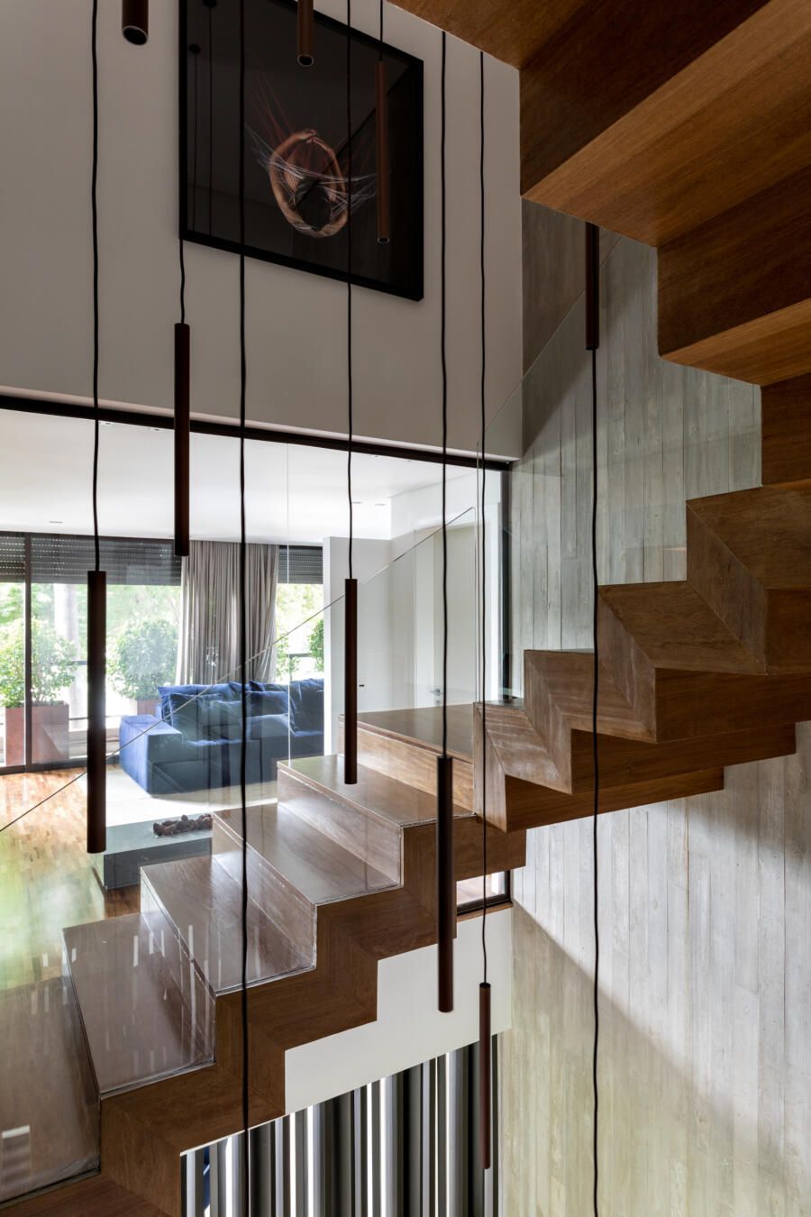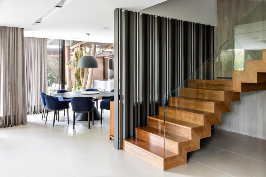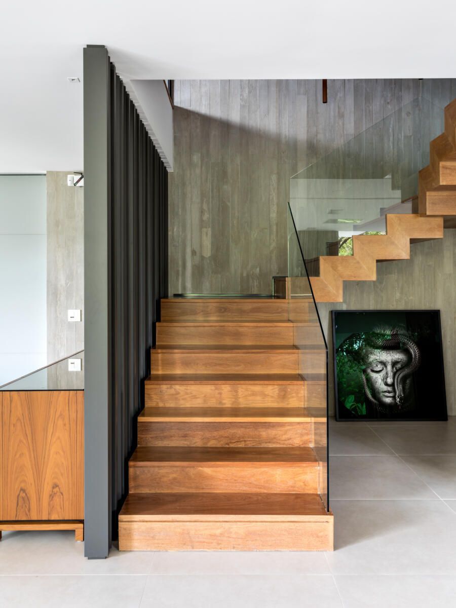 “A escada é toda revestida em madeira Cumaru, sua parede em tiras de concreto, e tudo isso é protegido pelos panos de vidro.”