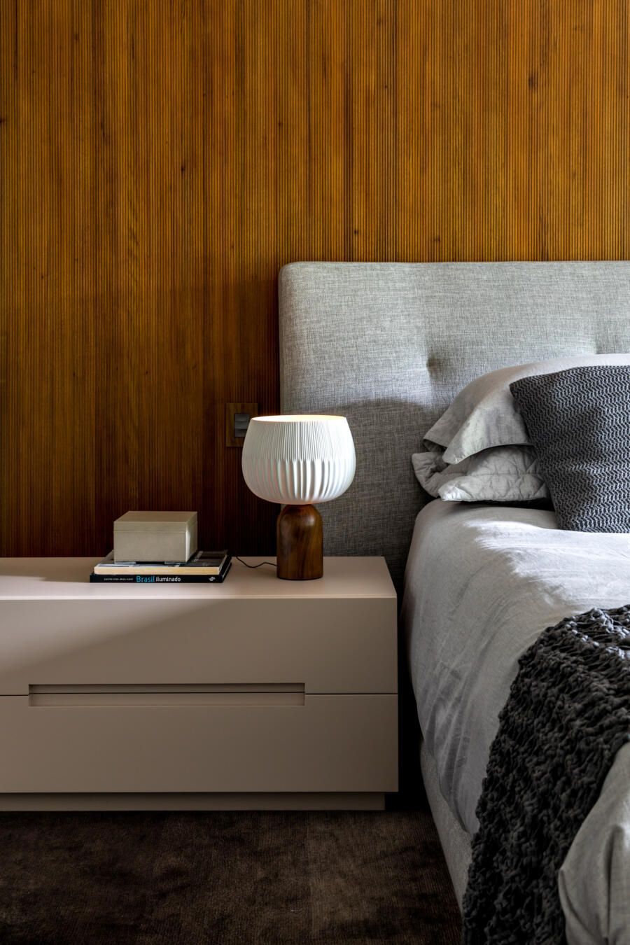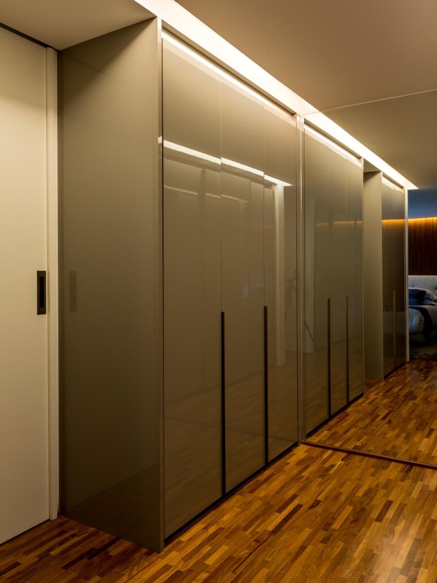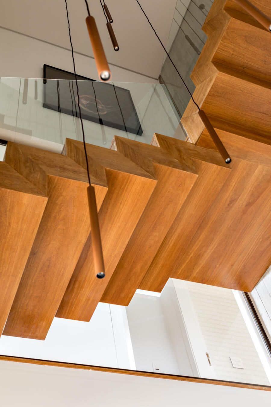 “A escada é toda revestida em madeira Cumaru, sua parede em tiras de concreto, e tudo isso é protegido pelos panos de vidro.”
