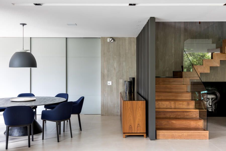 Outro ponto forte do projeto é a escada que dá acesso à área íntima da casa e ao solarium.