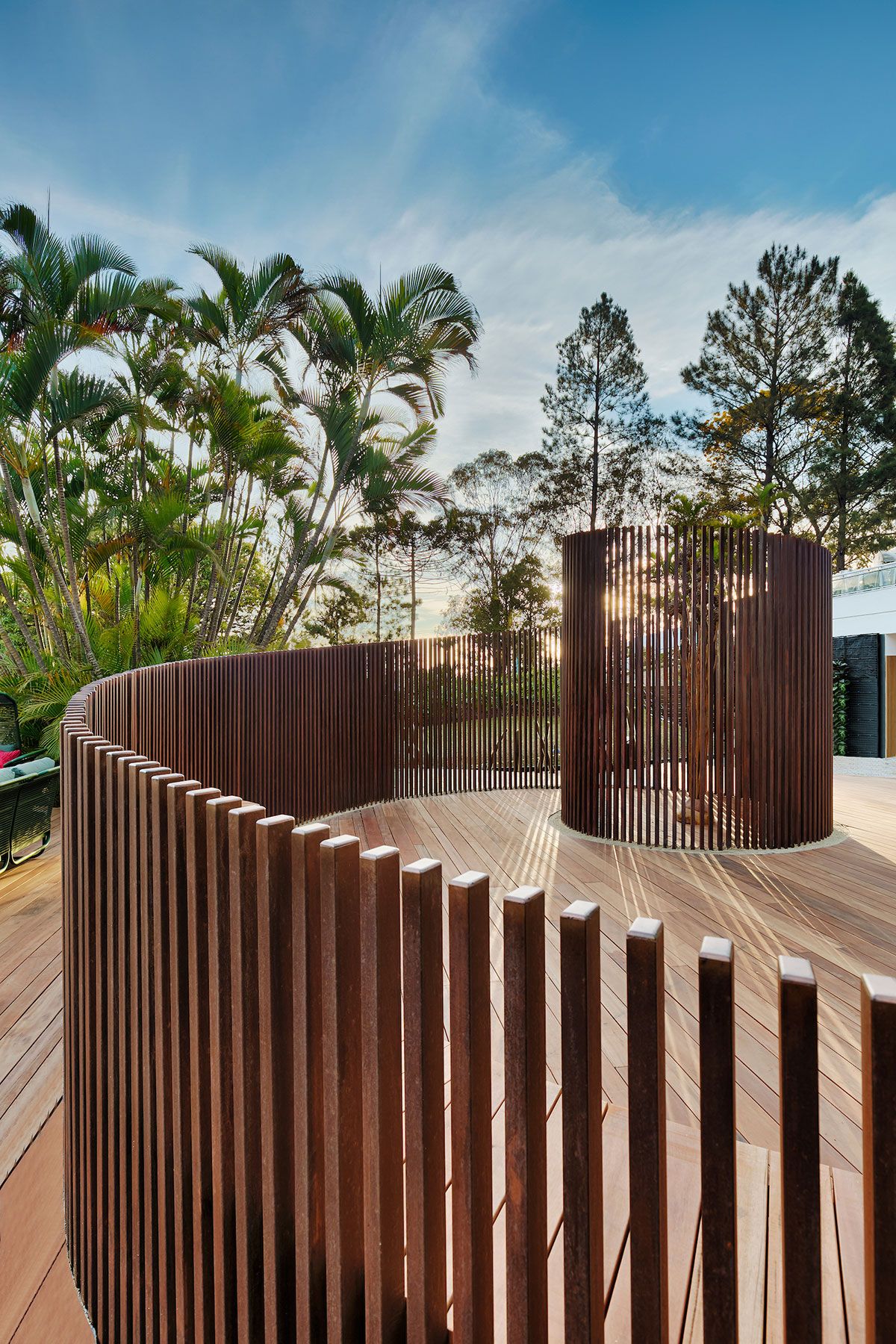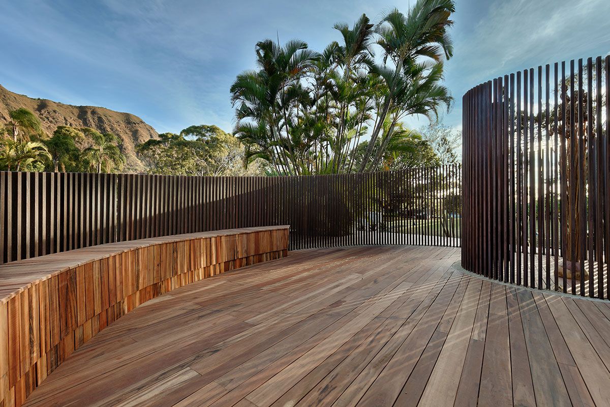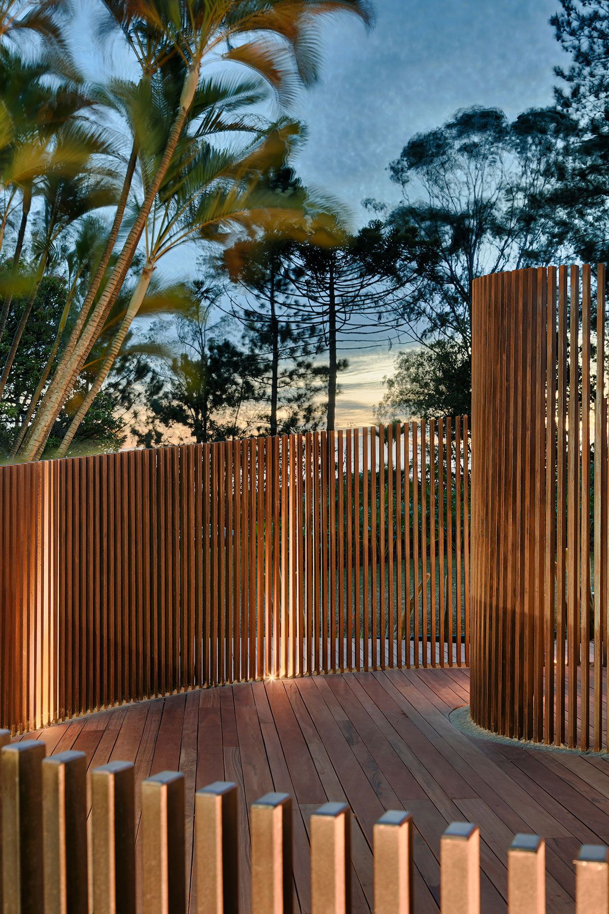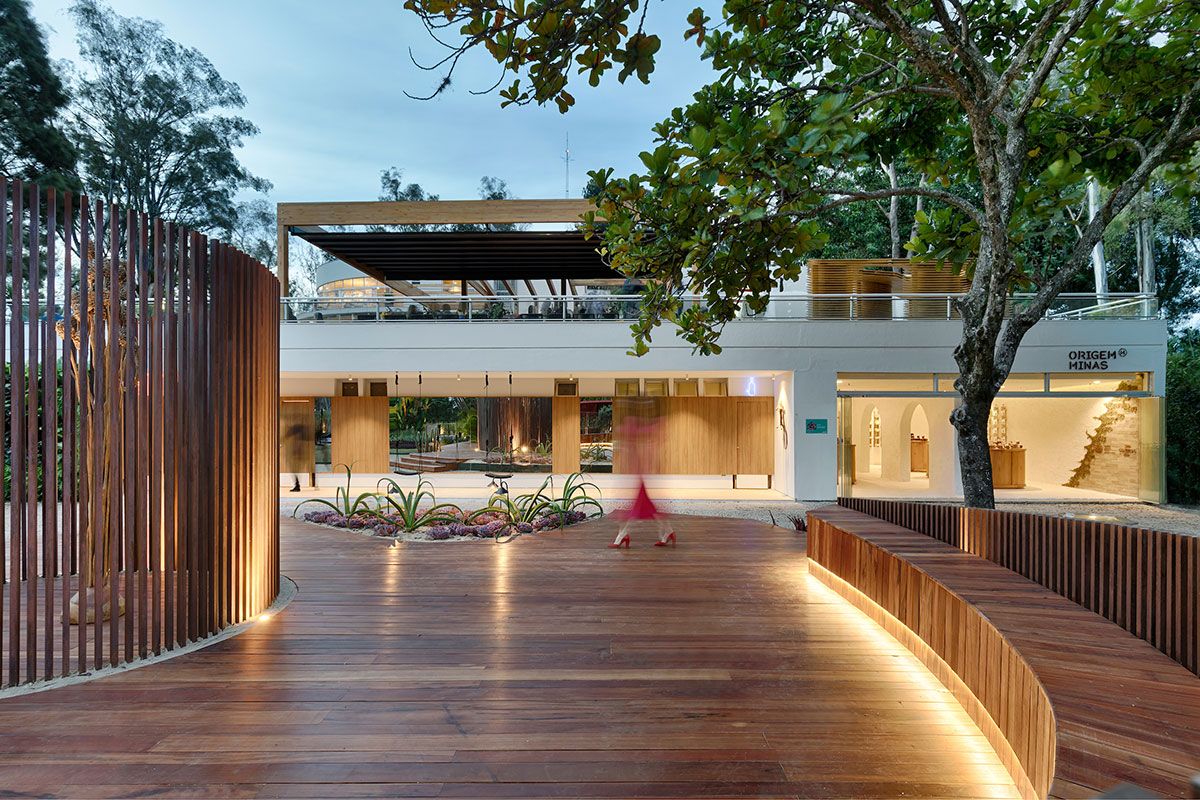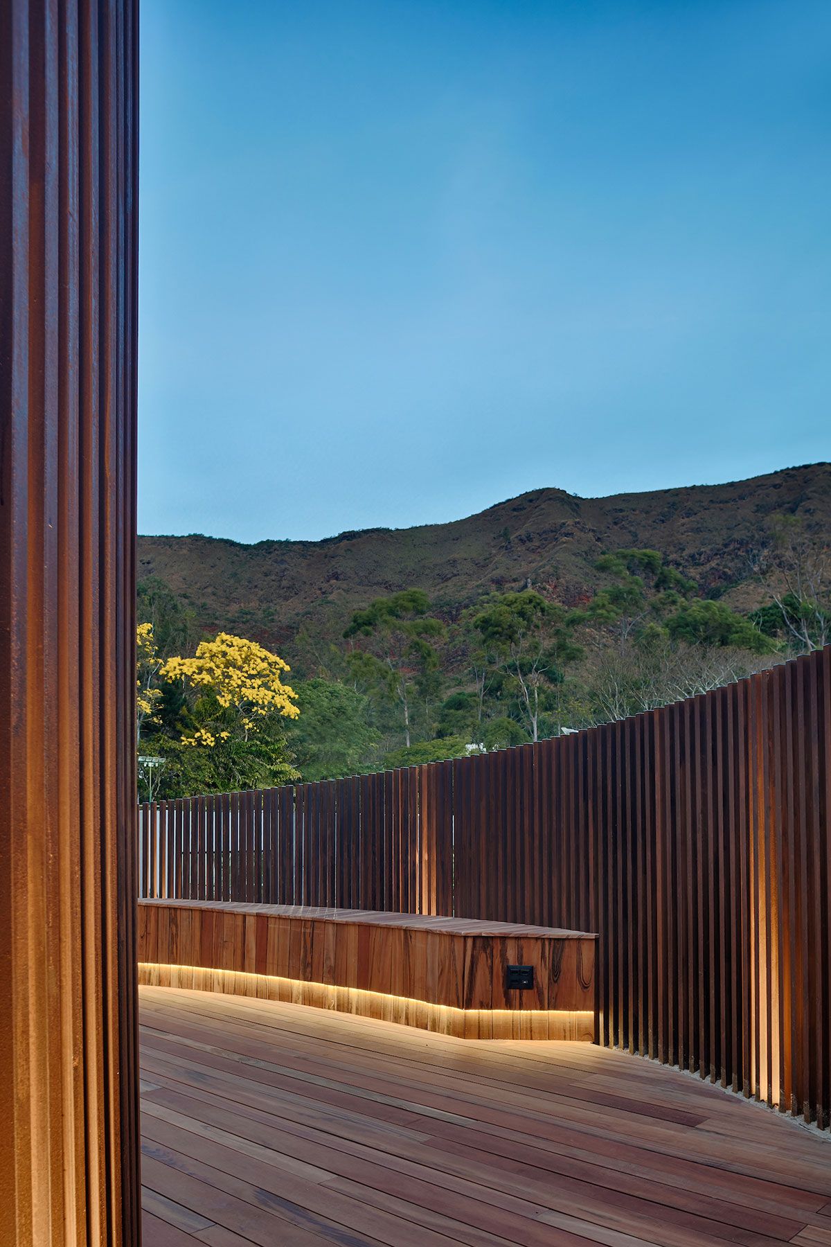 A área externa foi concebida para proporcionar ao público uma experiência sensorial e de conexão intensa com a natureza. No centro dela se ergue uma estrutura vertical montada a partir de 420 ripas de metal oxidado, em forma de caracol, sobre um piso mais elevado que, juntos, formam um conjunto arquitetônico de design totalmente orgânico, no estilo Burle Marx.