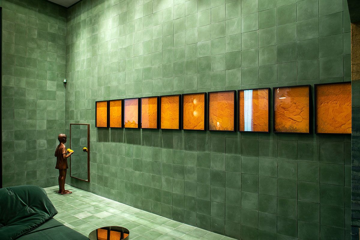 Naomi criou um espaço de entrada como um cubo minimalista e monocromático de ladrilhos hidráulicos verdes para que os visitantes pudessem entrar e logo sentar para contemplar os trabalhos dos artistas, como em um museu.