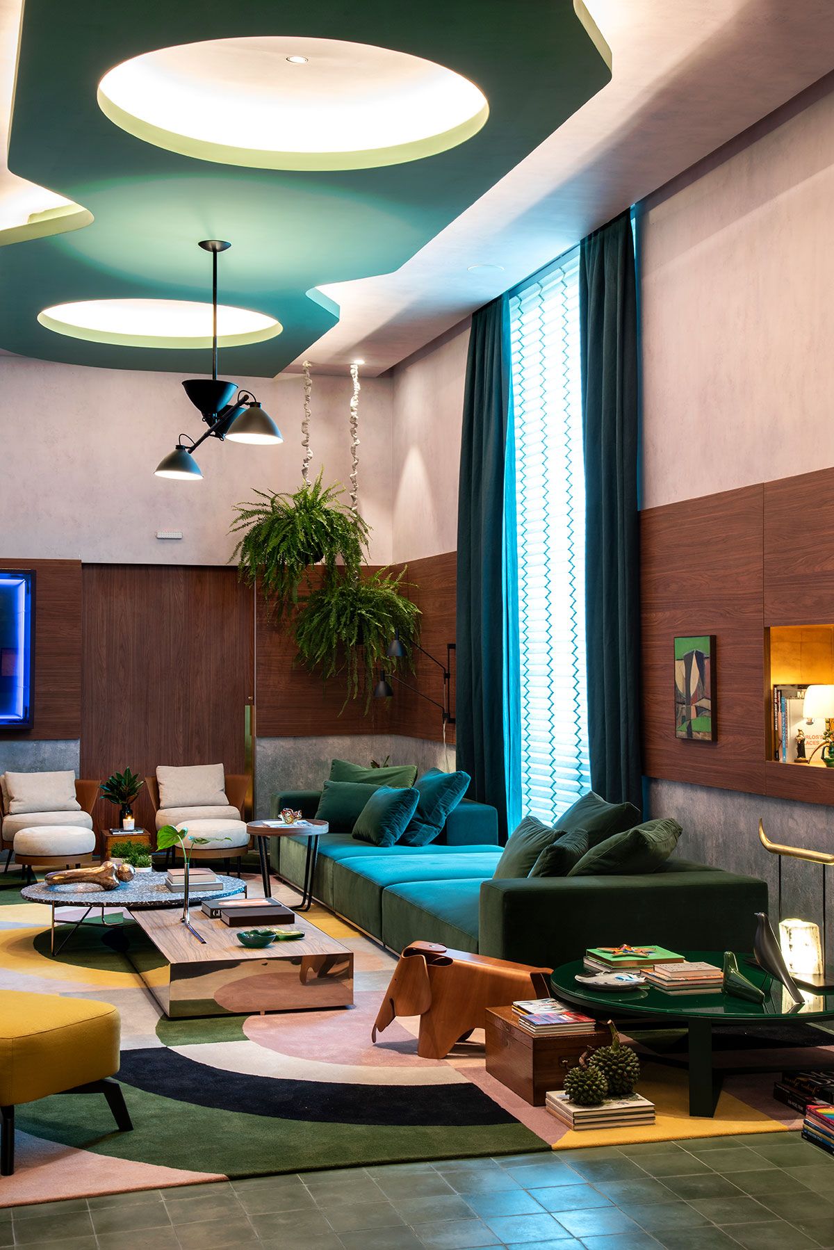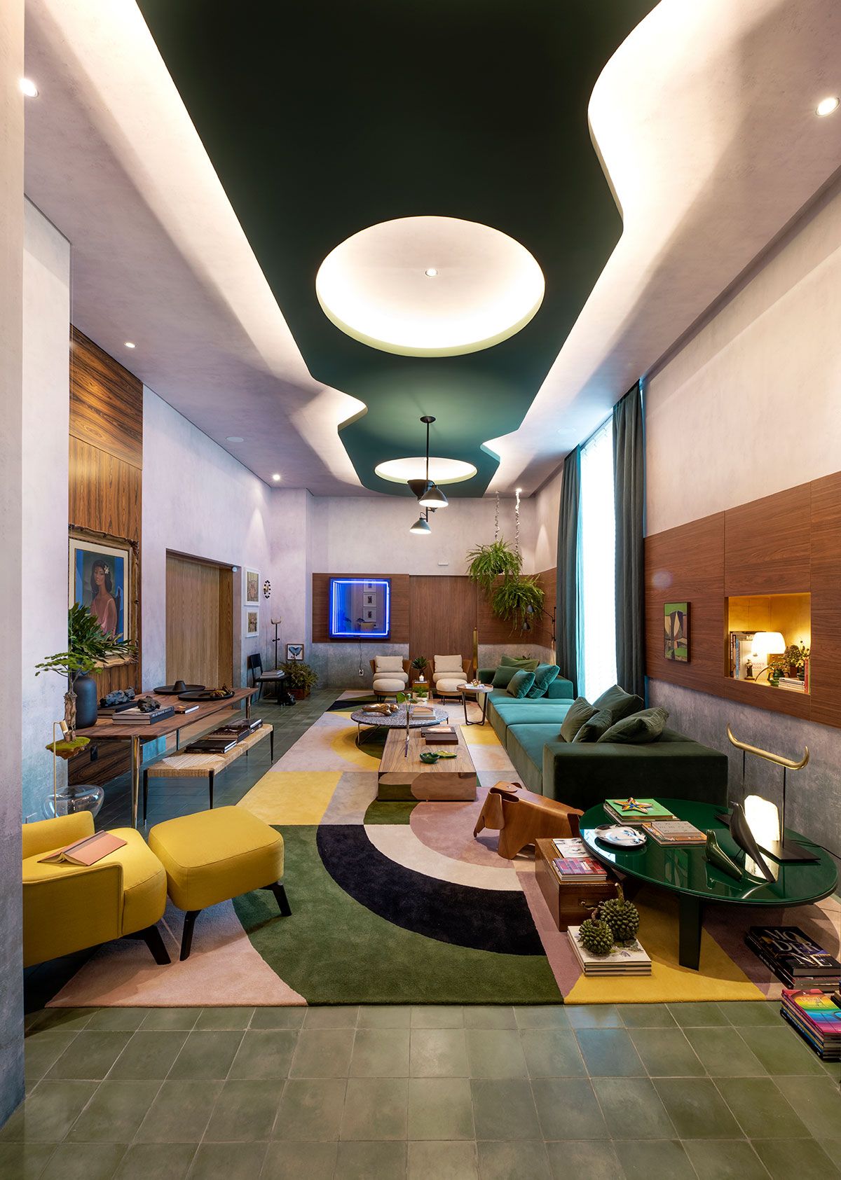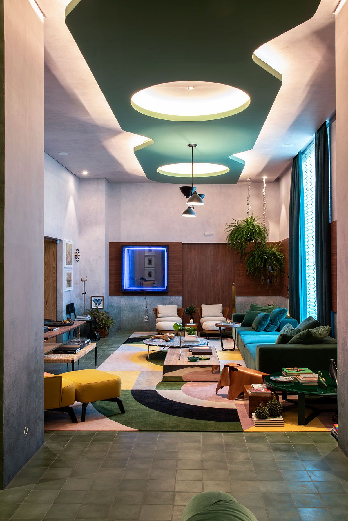 Projetei um caminho iluminado com círculos interligando entrada e o living, inspirada na arquitetura modernista dos anos 1950.