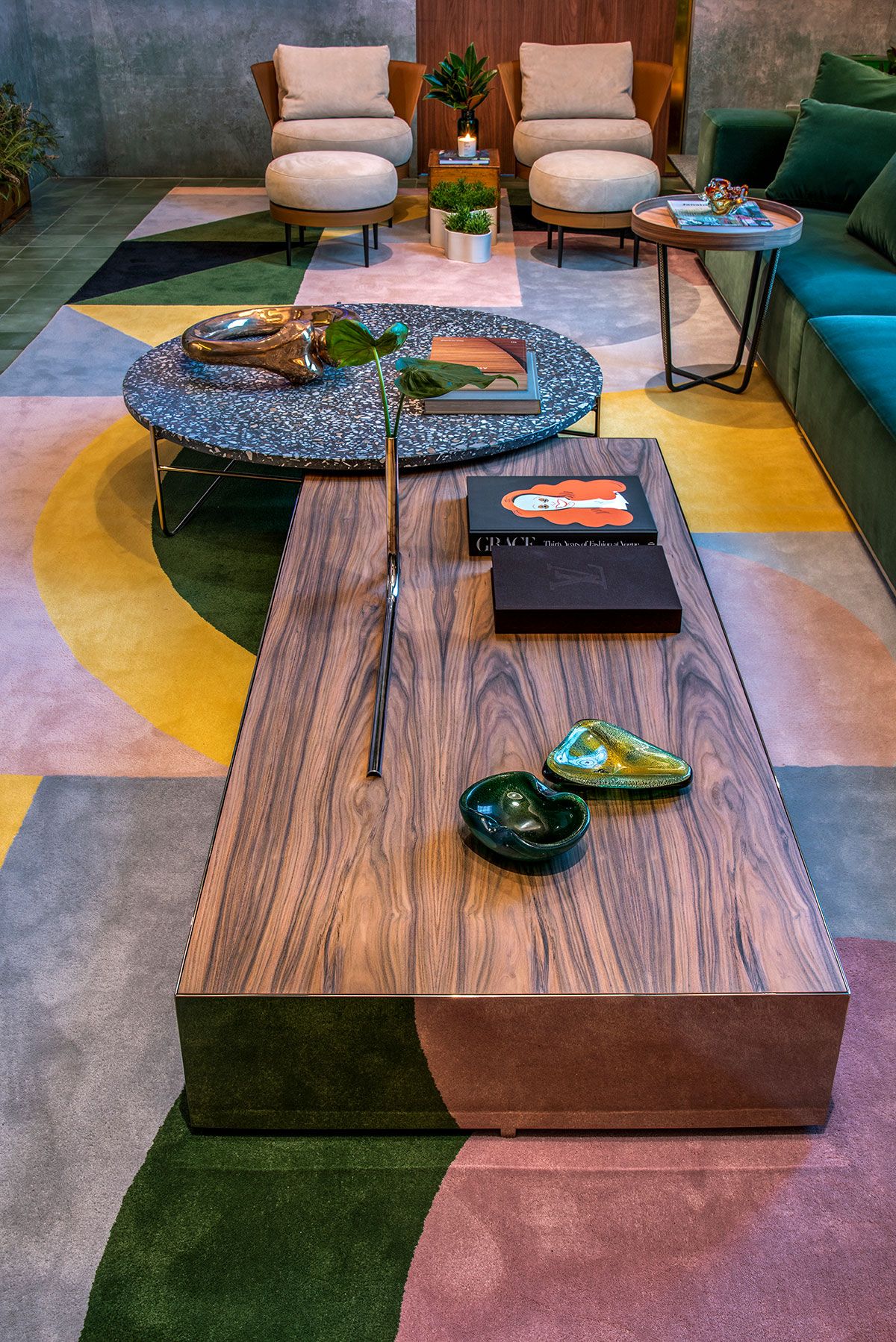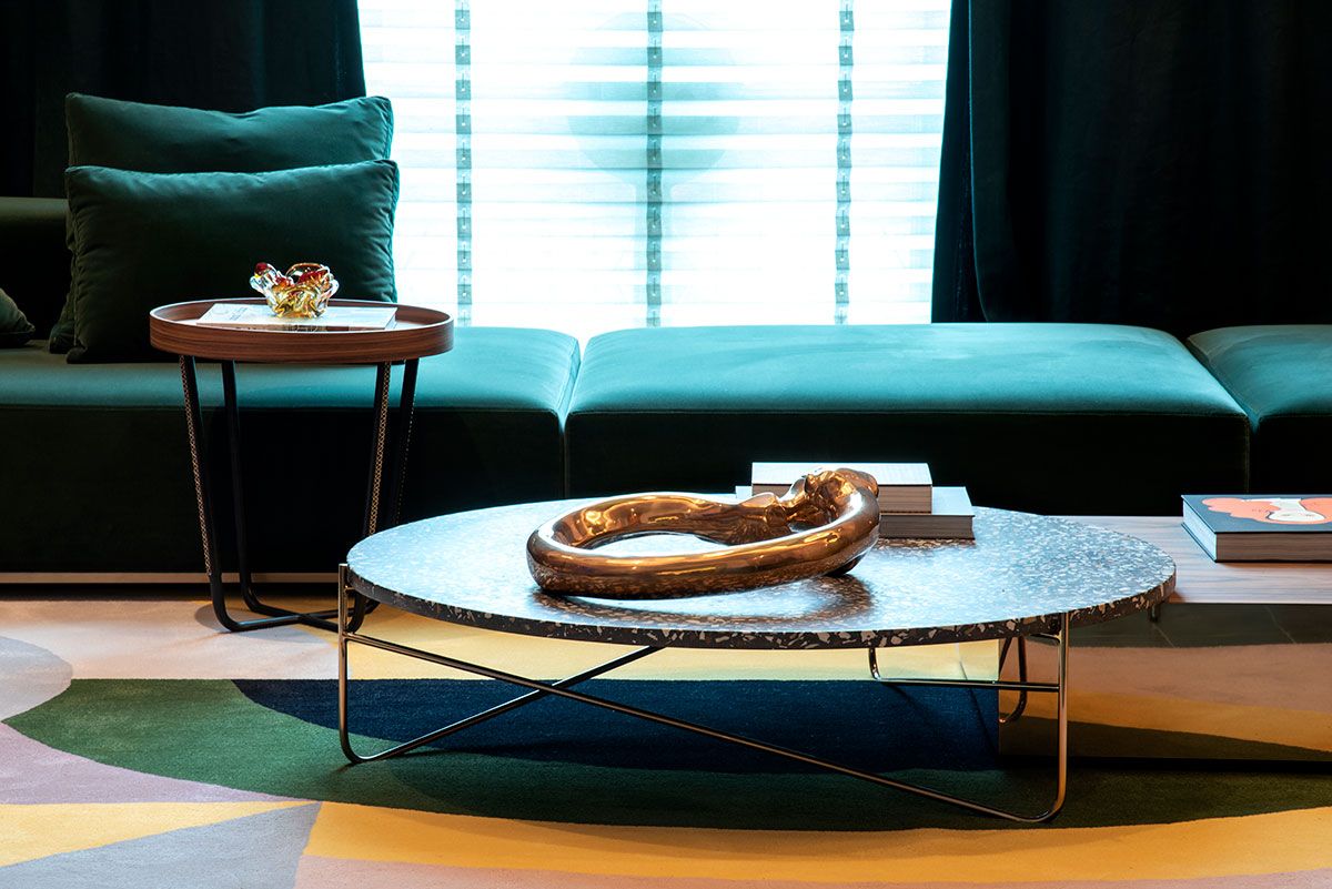 As peças de design juntam-se, de maneira harmônica, algumas peças de antiguidades. Para arrematar, arranjos florais e as samambaias voando colocadas em kokedamas, da florista Aline Matsumoto, e a borboleta aquarelada.