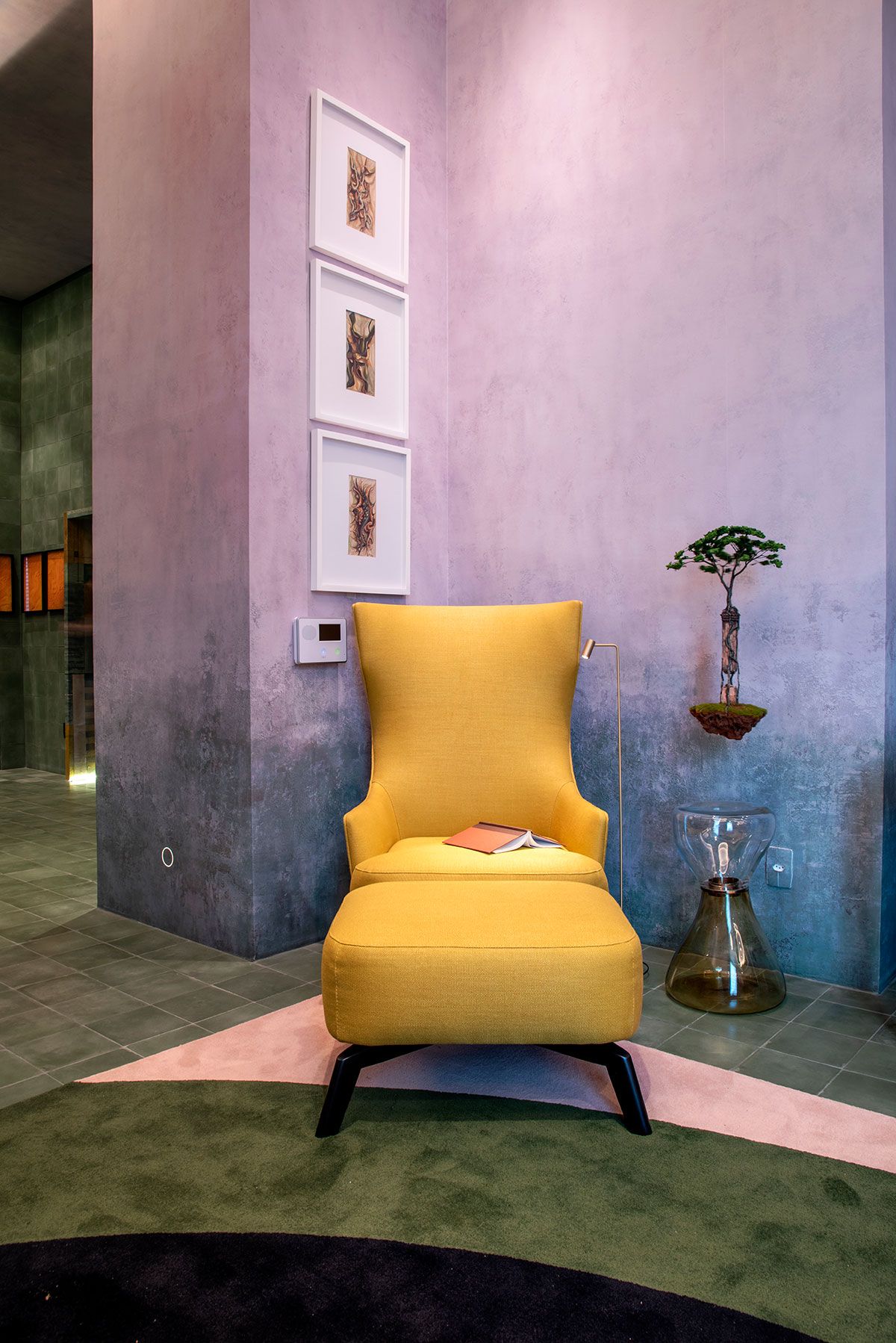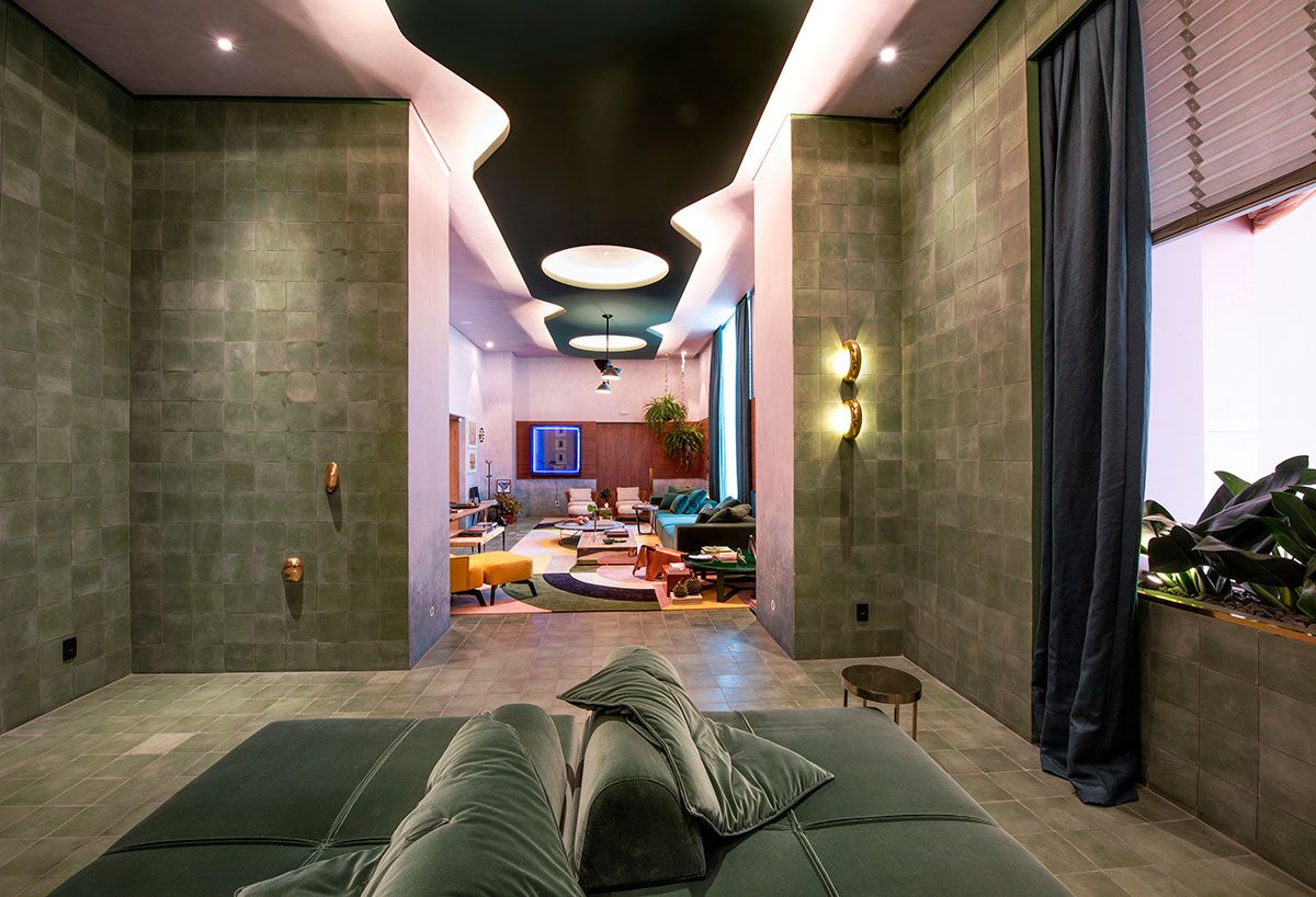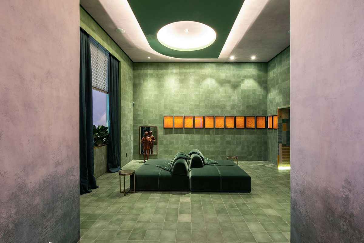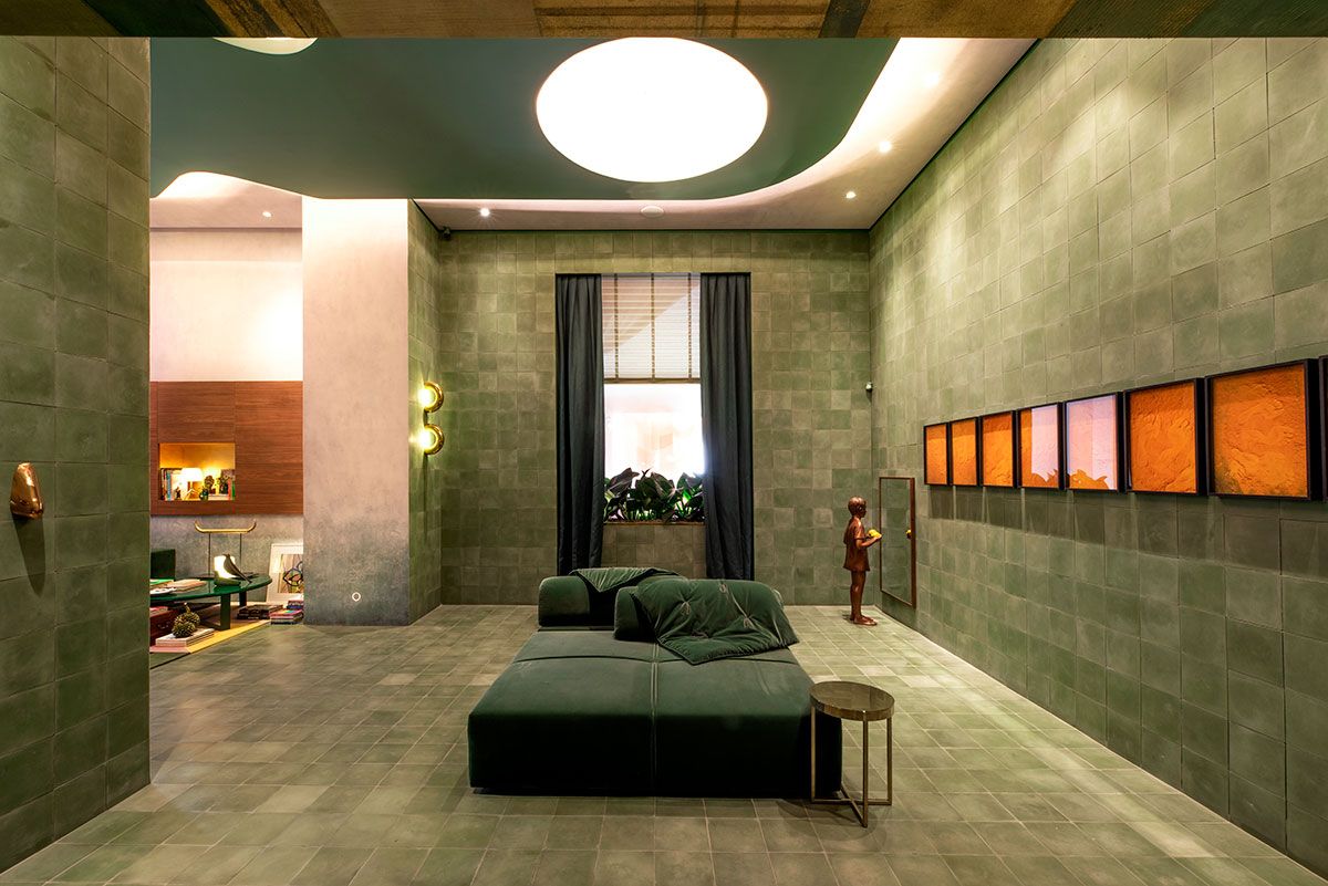 Naomi criou um espaço de entrada como um cubo minimalista e monocromático de ladrilhos hidráulicos verdes para que os visitantes pudessem entrar e logo sentar para contemplar os trabalhos dos artistas, como em um museu.