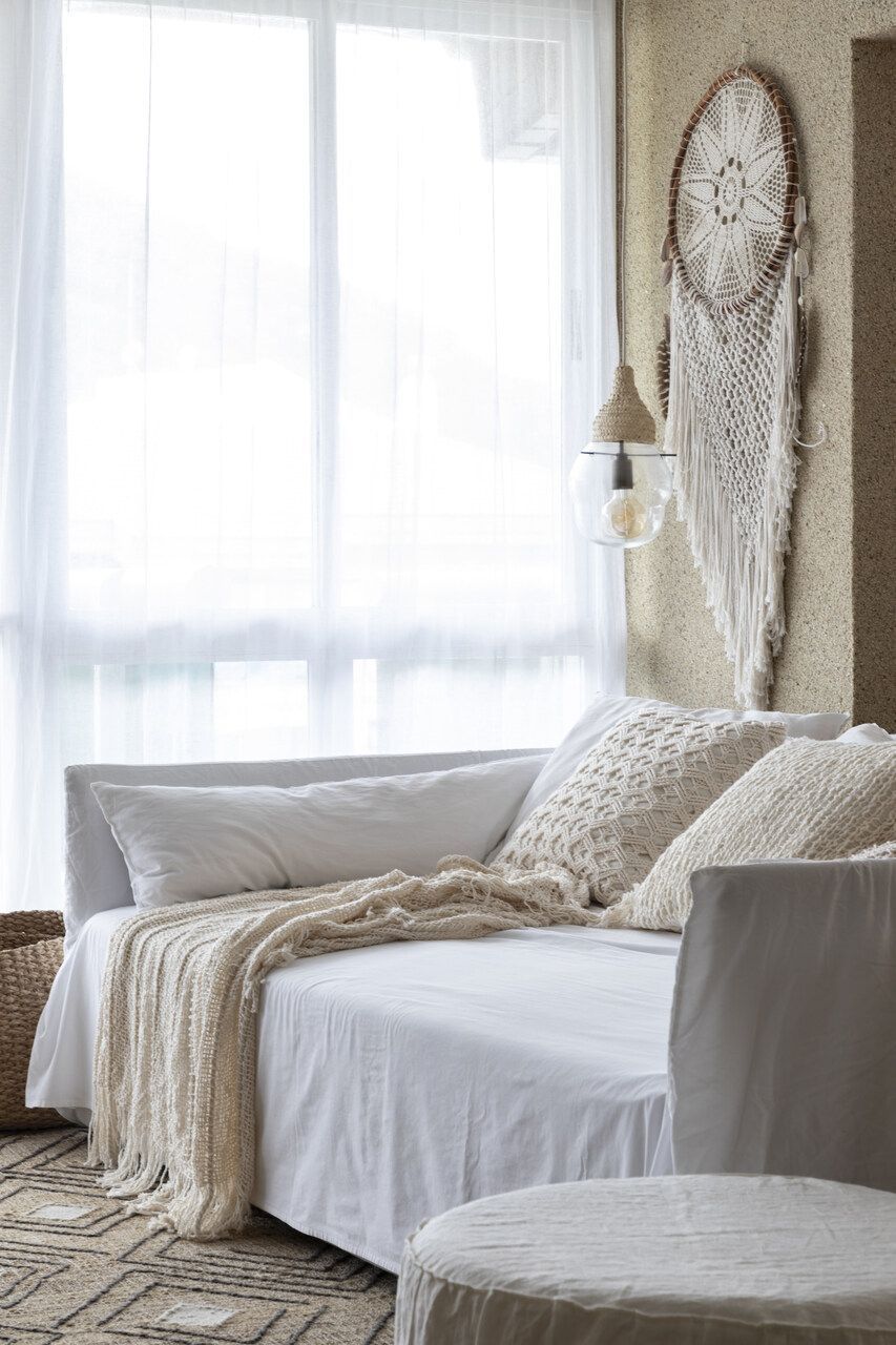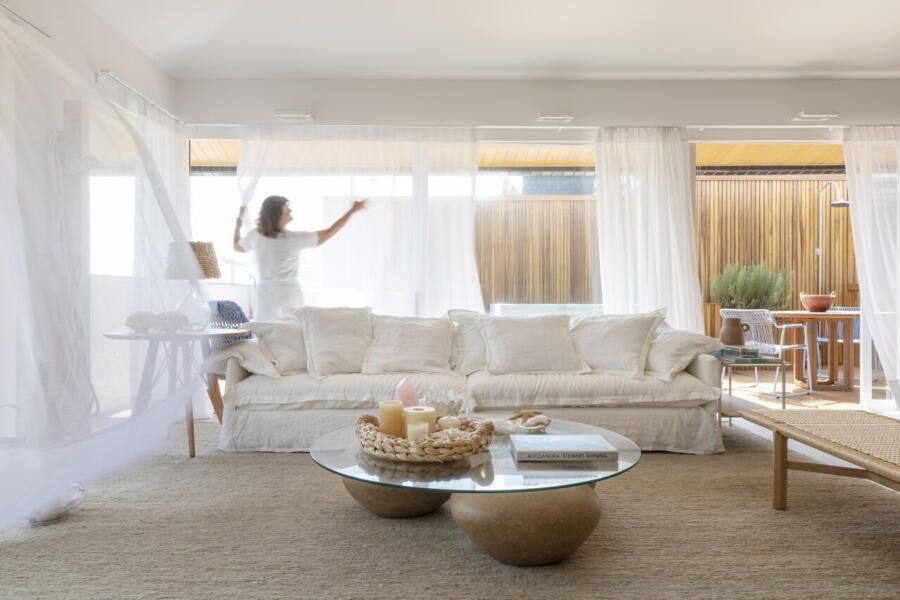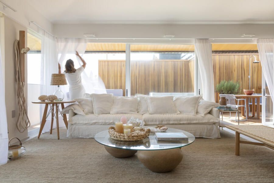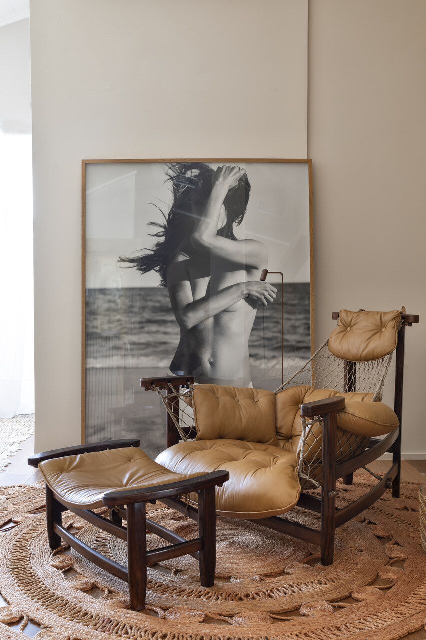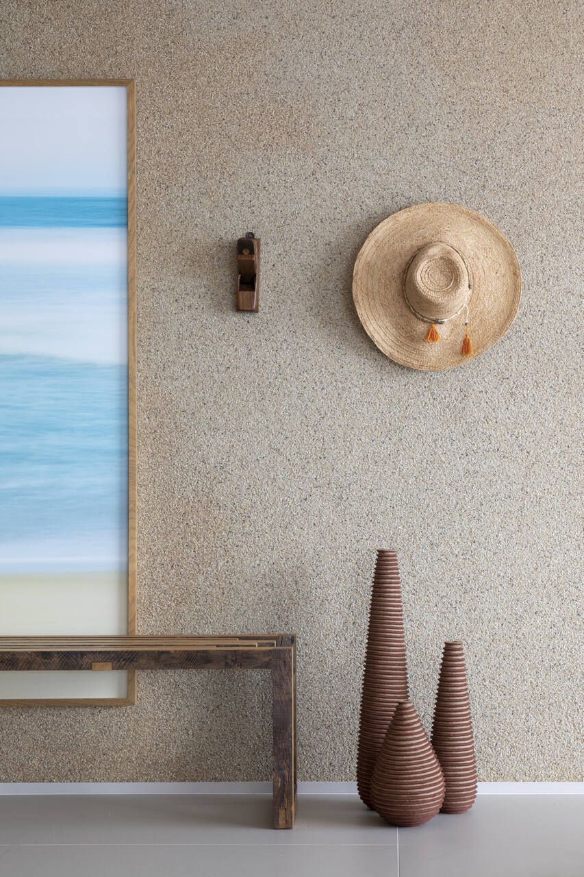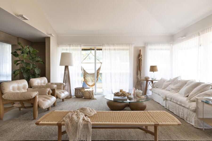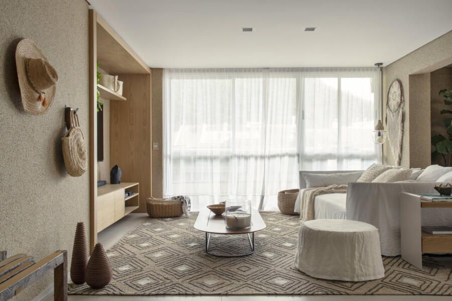 Procurando cumprir todos os desejos da modelo, Juliana Pippi desenvolveu o projeto com muitos elementos naturais, e tecidos como linho, algodão e palha estão presentes em todos os ambientes, desde as cortinas até as roupas de cama e revestimentos dos estofados. Já os tapetes, em tear, trazem tramas naturais e combinam muito bem com as paredes revestidas com textura areia.