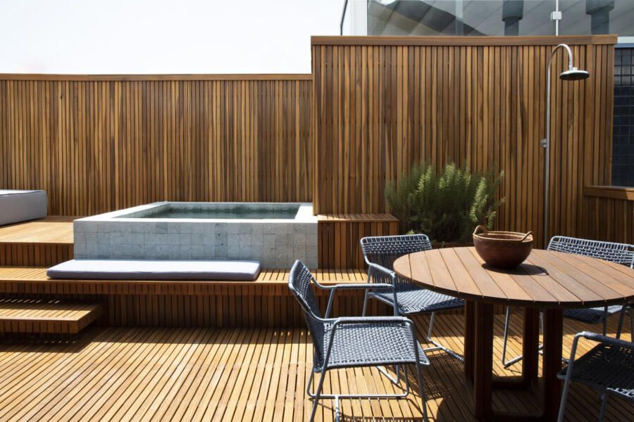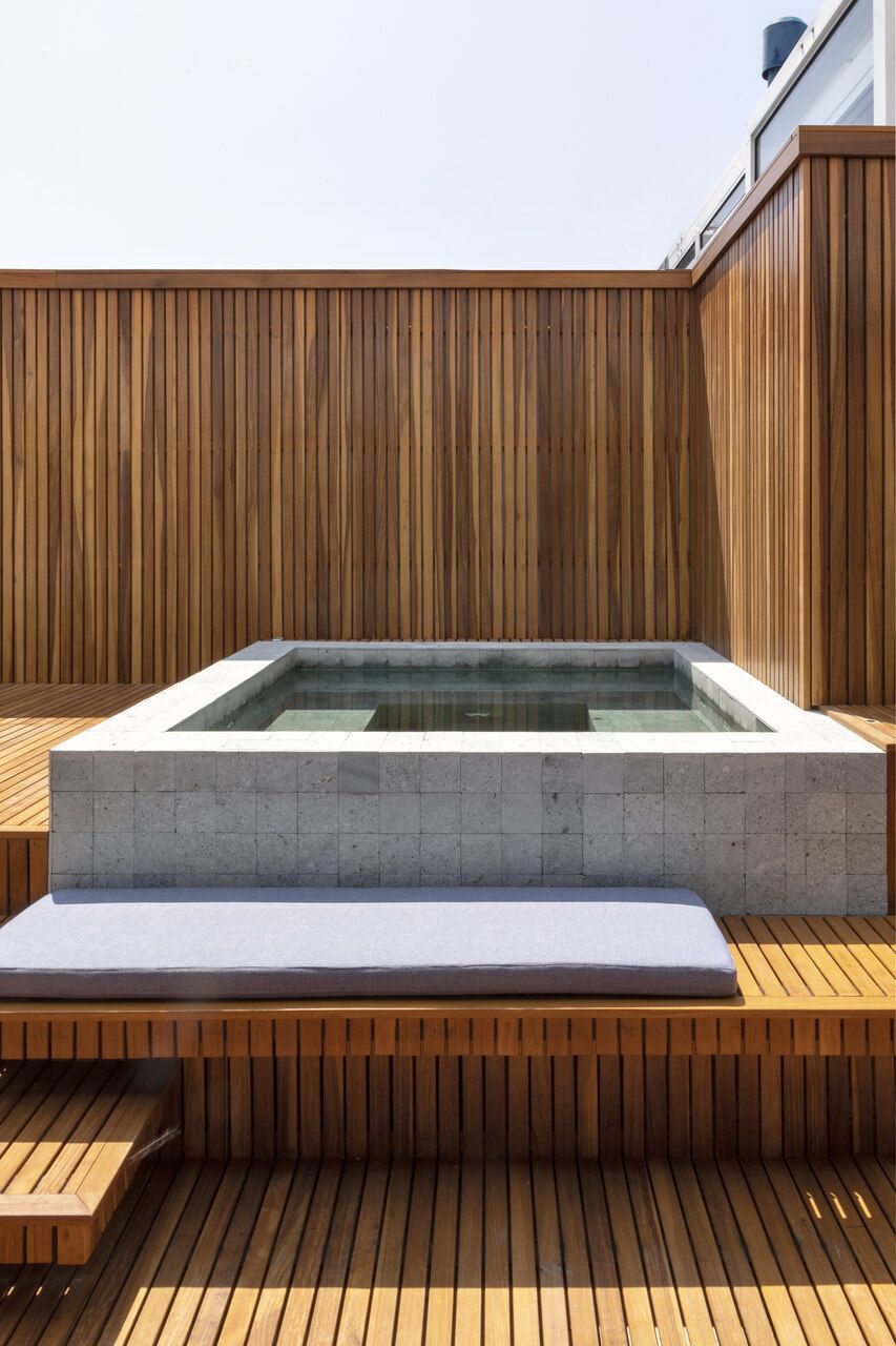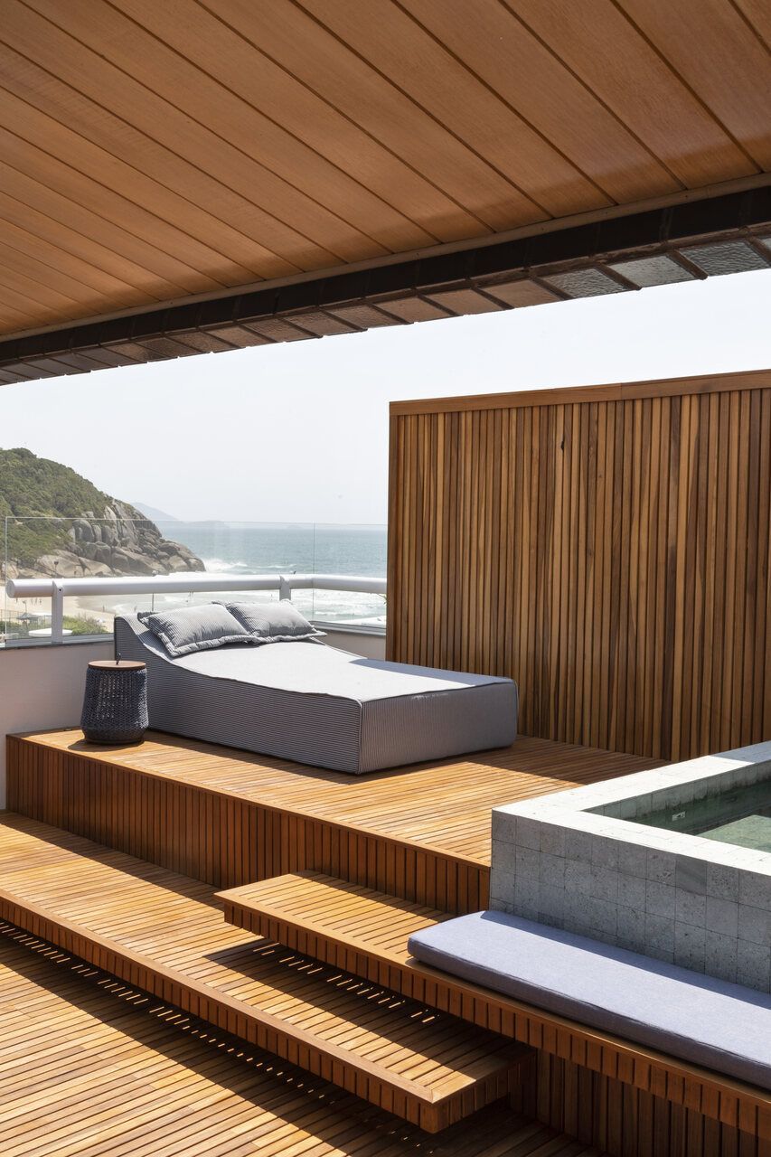 Um spa construído sob medida e revestido em pedra natural reforça a cara de casa do apê no terraço, com uma vista linda para o mar. O piso do deck em madeira Cumaru e com painéis ripados na parede do fundo garantem a privacidade necessária. Os degraus foram repaginados e transformados e bancos e espaços, deixando o ambiente mais aconchegante para receber visitas e amigos.