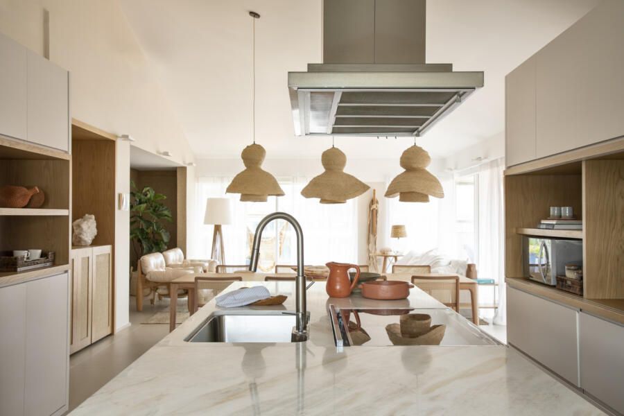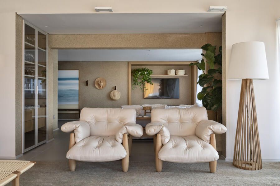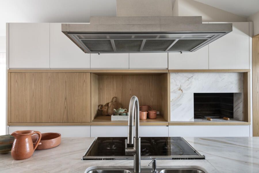 A cozinha integrada à sala tem nichos em lâmina de madeira natural com portas deslizantes, solução inteligente para esconder os eletros e a churrasqueira no armário.