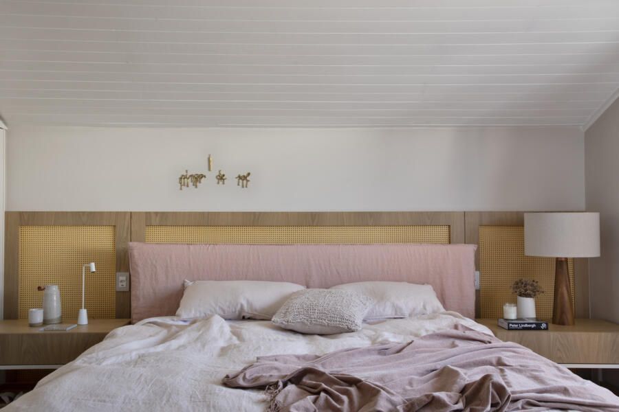 Toda a marcenaria, o sofá e a cama da suíte master forma projetados pelo escritório de Juliana Pippi. Foto: Ruy Teixeira / Divulgação