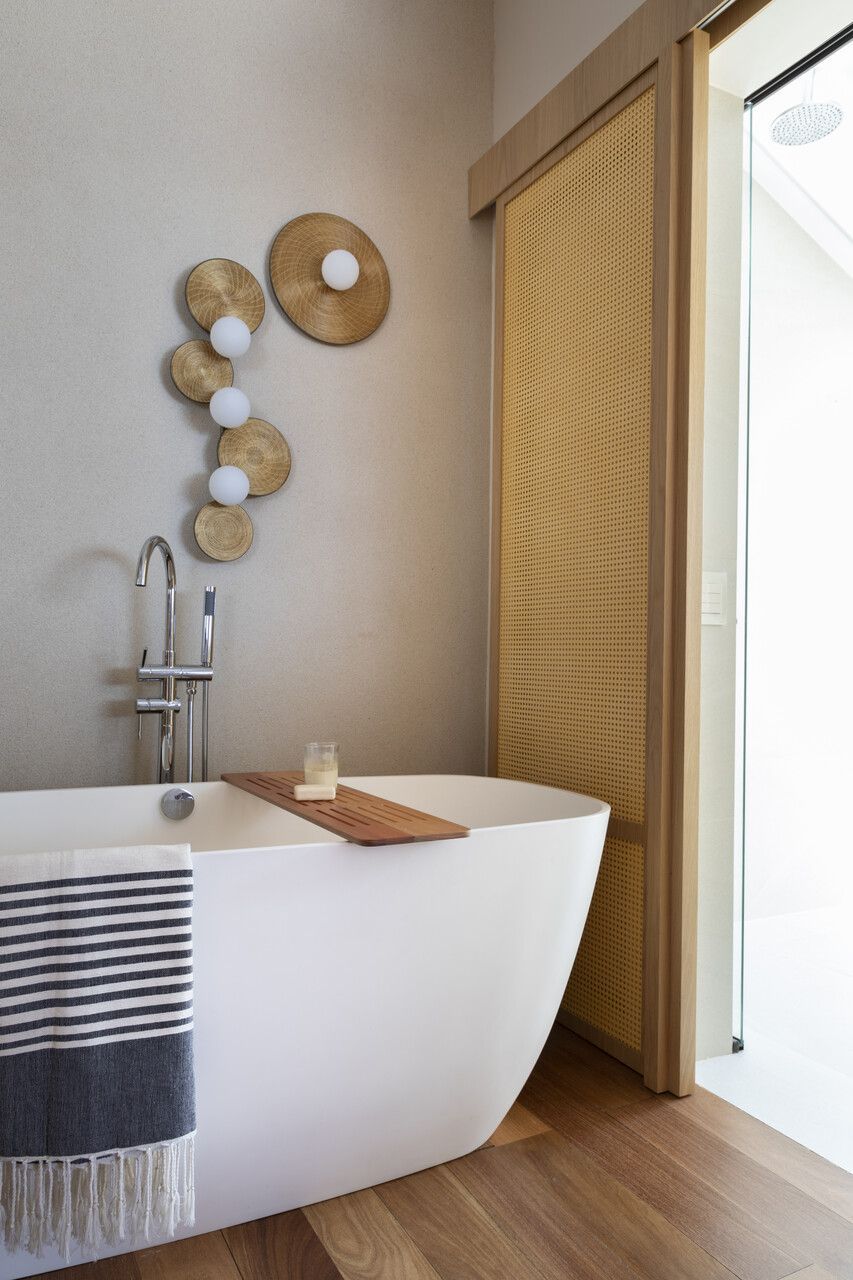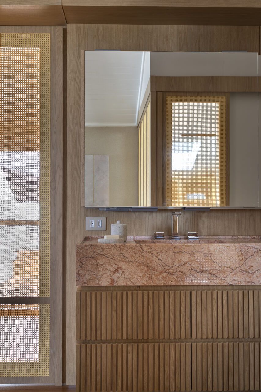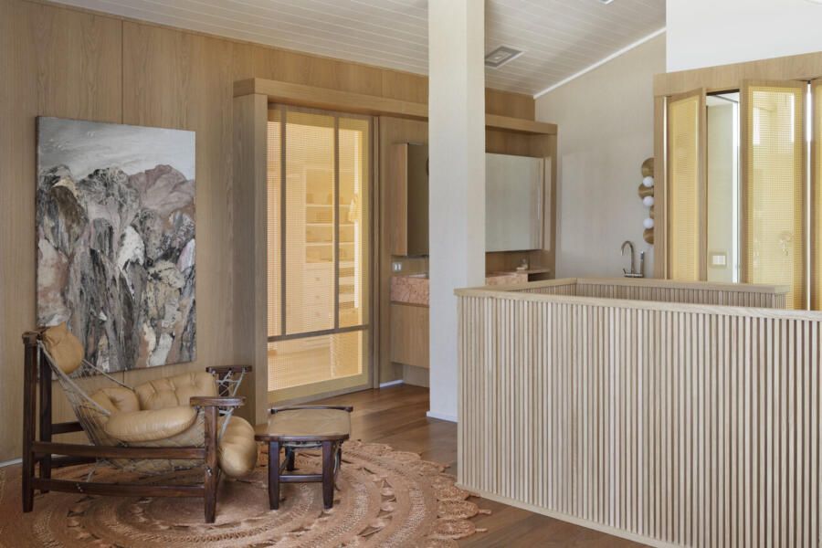Na suíte master, o banheiro está separado com painéis que pode ser abertos. A cabeceira e os painéis trazem mais elementos naturais à suíte, todos em palha natural.