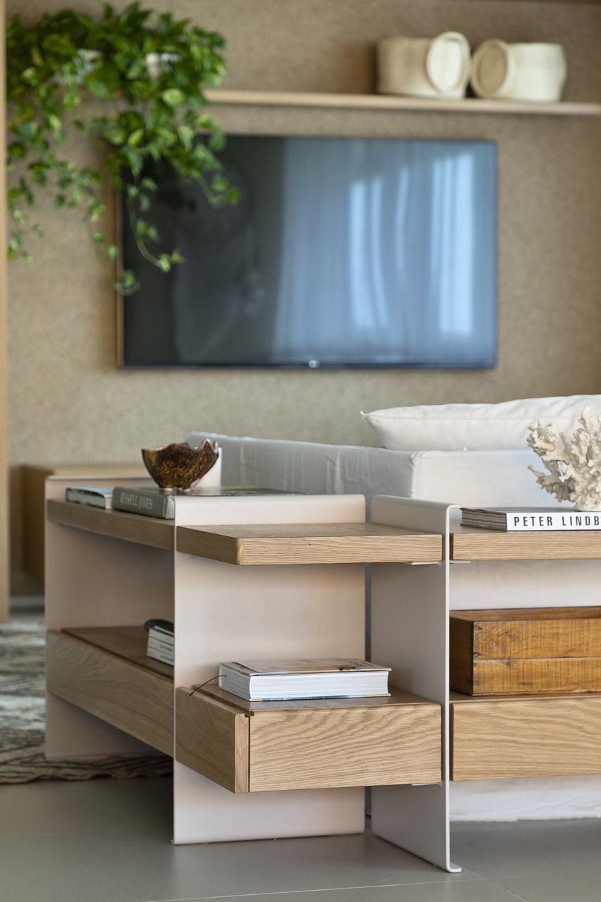 Na sala de estar, o sofá Camadas com capa em cambraia de linho foi projetado pelo próprio escritório da arquiteta Juliana Pippi. Foto: Ruy Teixeira / Divulgação