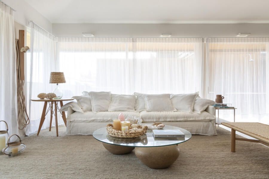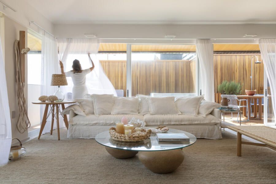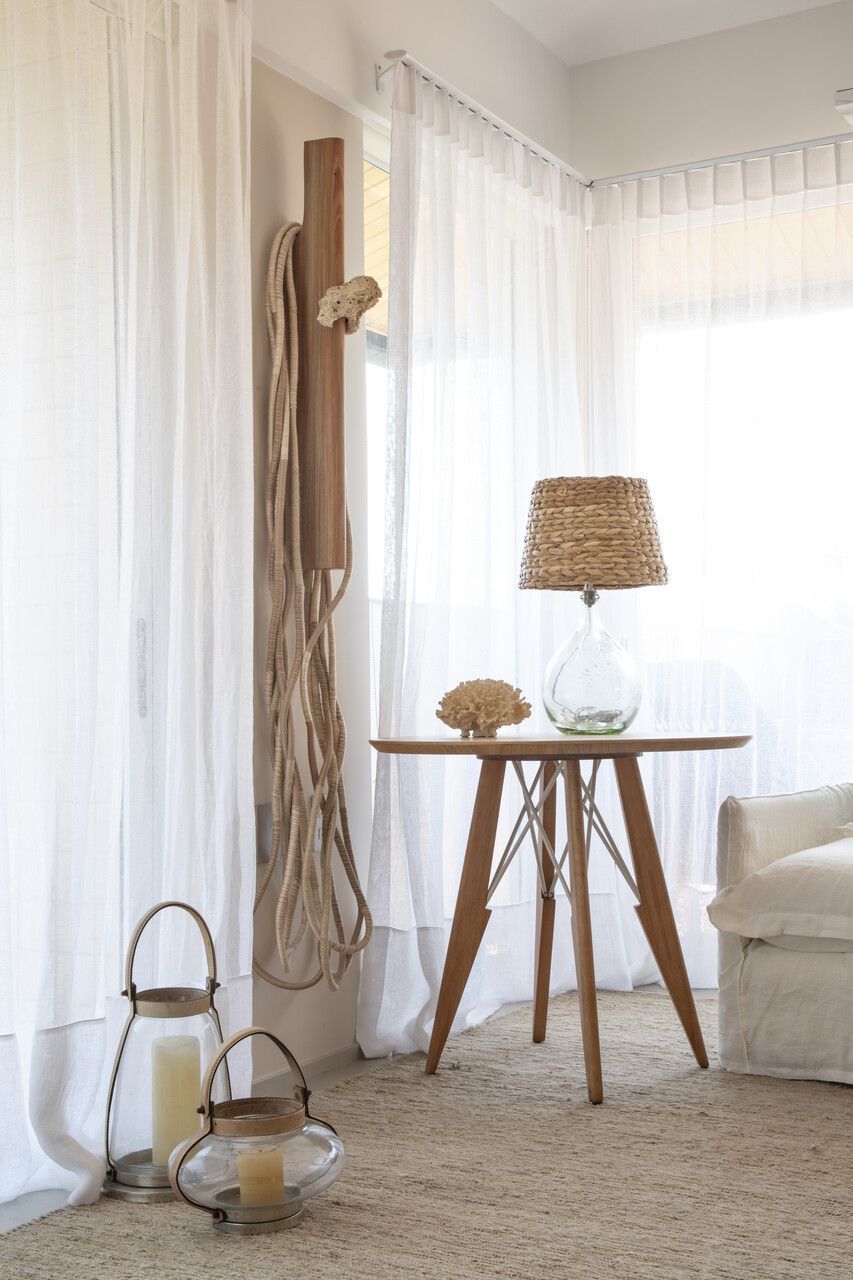 Procurando cumprir todos os desejos da modelo, Juliana Pippi desenvolveu o projeto com muitos elementos naturais, e tecidos como linho, algodão e palha estão presentes em todos os ambientes, desde as cortinas até as roupas de cama e revestimentos dos estofados. Já os tapetes, em tear, trazem tramas naturais e combinam muito bem com as paredes revestidas com textura areia.
