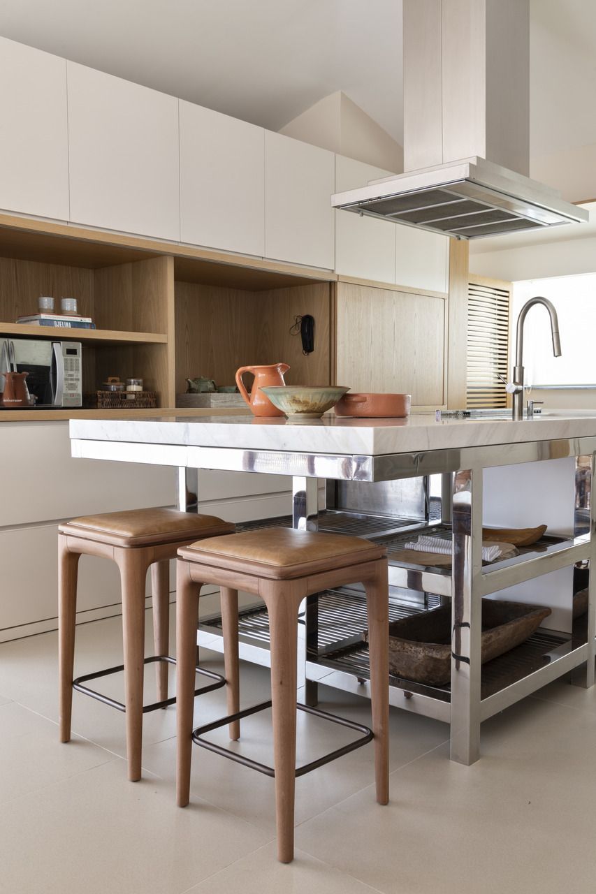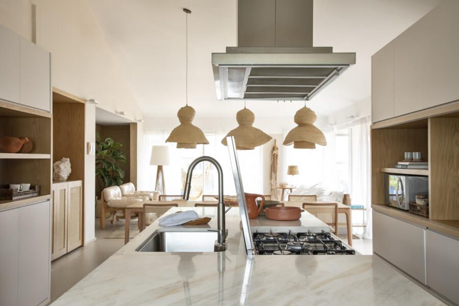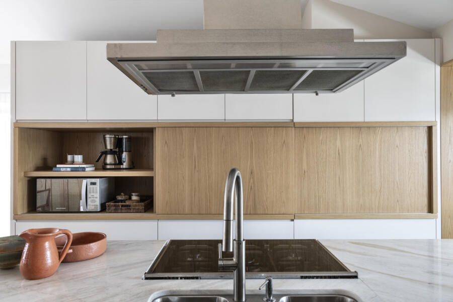 A cozinha integrada à sala tem nichos em lâmina de madeira natural com portas deslizantes, solução inteligente para esconder os eletros e a churrasqueira no armário.