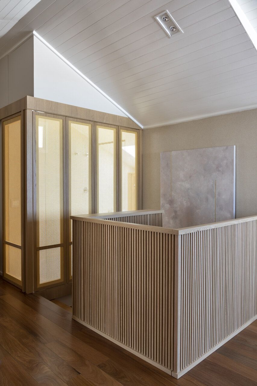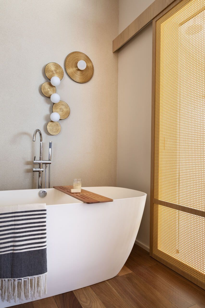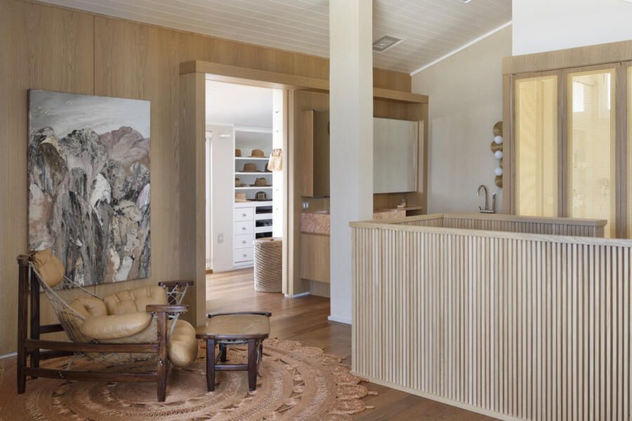 Na suíte master, o banheiro está separado com painéis que pode ser abertos. A cabeceira e os painéis trazem mais elementos naturais à suíte, todos em palha natural.