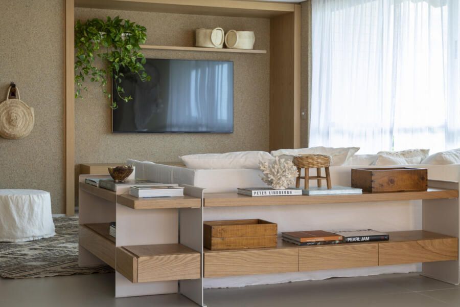 Na sala de estar, o sofá Camadas com capa em cambraia de linho foi projetado pelo próprio escritório da arquiteta Juliana Pippi. Foto: Ruy Teixeira / Divulgação