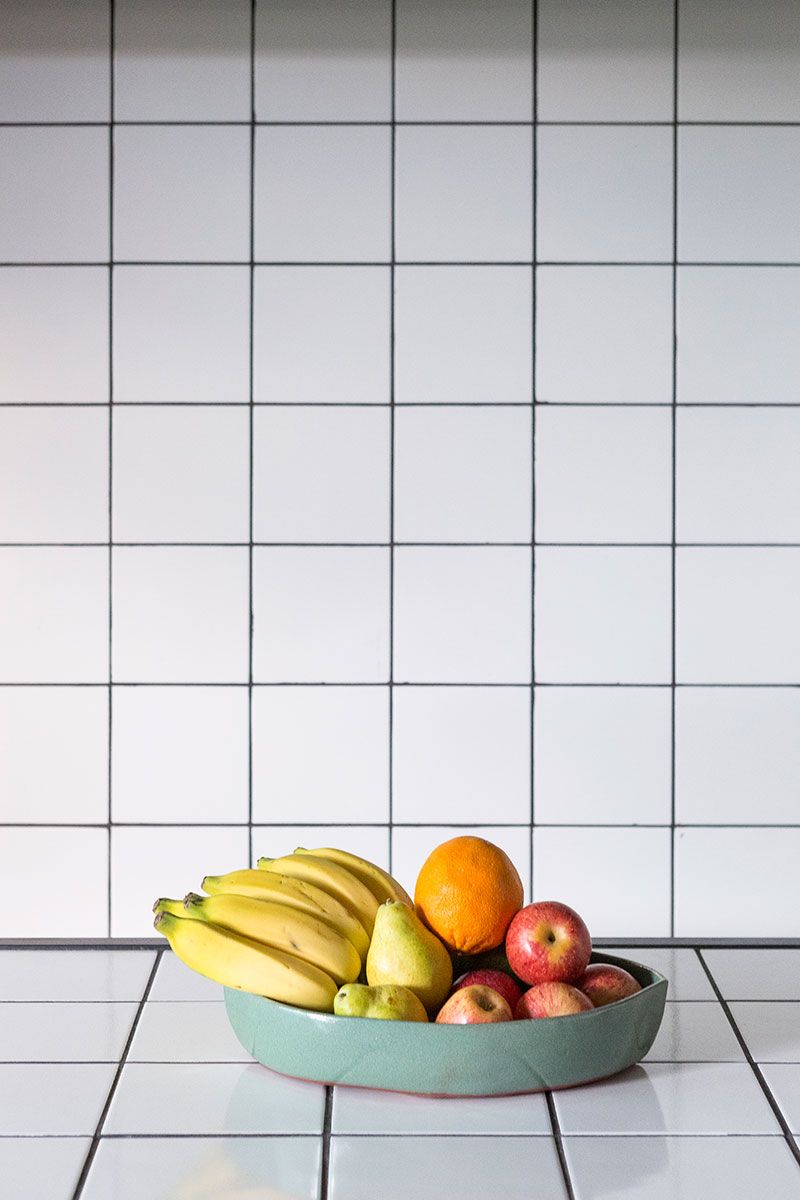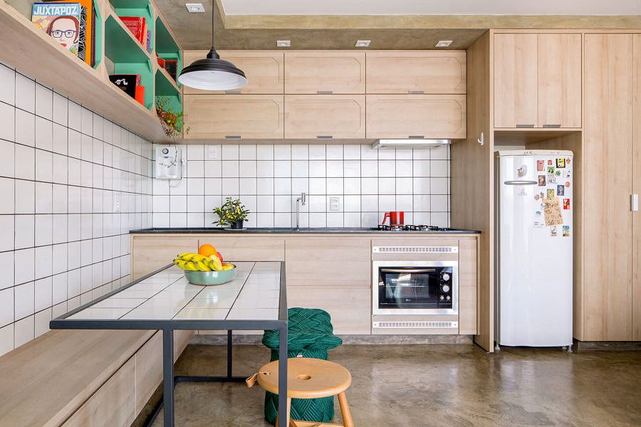 O revestimento em azulejo branco destaca a área de cozinhar e representa o material típico das cozinhas caracterizadas nos quadrinhos. O azulejo se estende e reveste também o tampo da mesa de jantar em ferro, formando um jogo de continuidade de texturas.