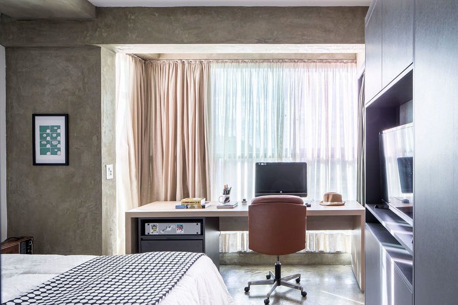 O apartamento original possuía um único espaço aberto e iluminado por amplas janelas ao longo de toda fachada, além de uma cozinha e um banheiro. A proposta da profissional foi manter a sensação de amplitude do studio e ao mesmo tempo possibilitar momentos de privacidade quando necessário.