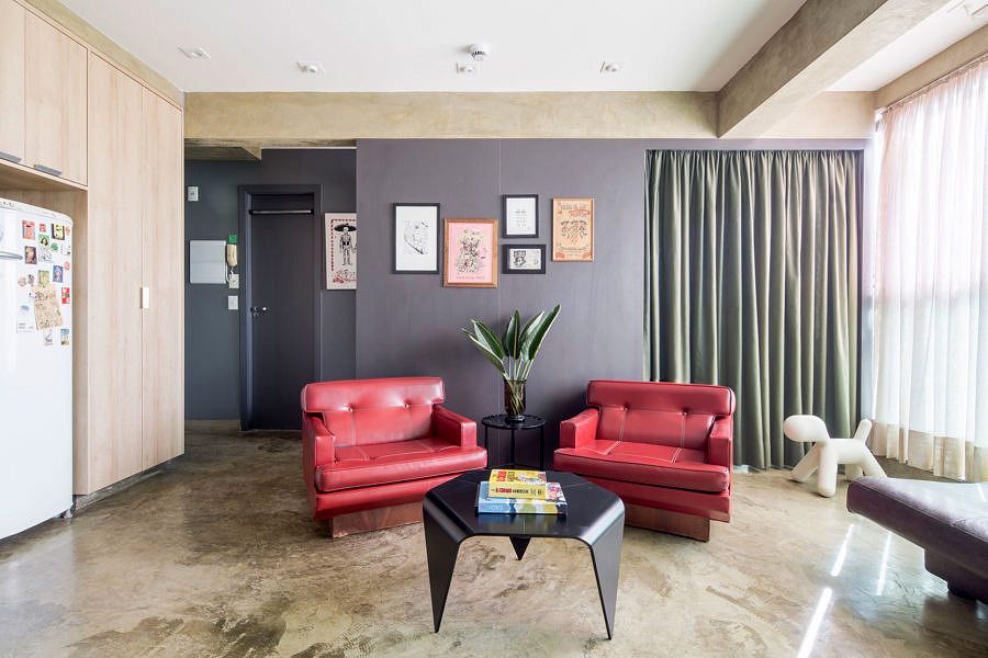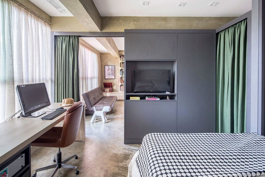 Para isso, criou-se uma leve separação entre a área social e a área de dormir e trabalhar através de uma divisória em marcenaria cinza, com aberturas que podem ser fechadas por cortinas de veludo verde. O móvel/divisória, quando voltado para o dormitório, funciona como suporte para a tv e armário, enquanto o lado voltado para a área social, serve como uma parede para quadros.