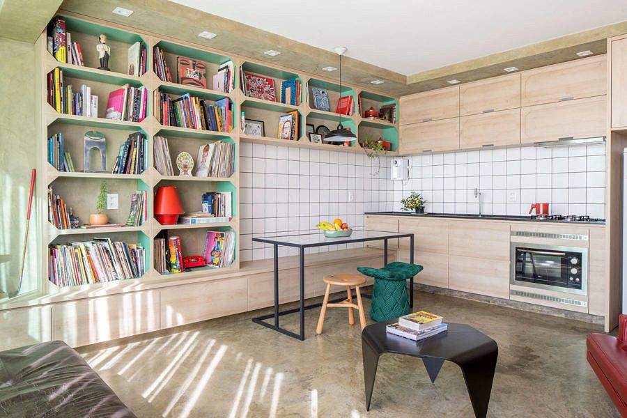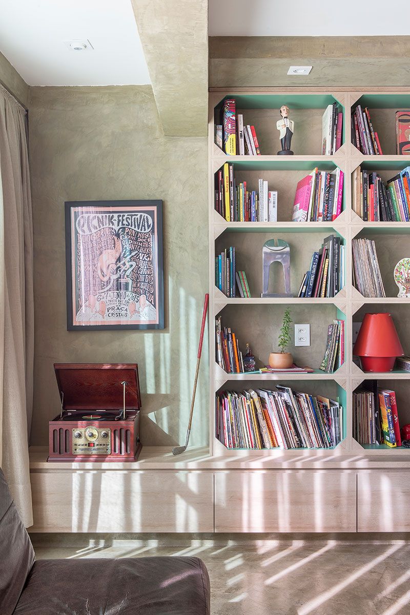 O cimento queimado presente no projeto faz referência a cidade de Brasília, onde o concreto é abundante. Para reforçar a sensação de continuidade e amplitude, o cimento queimado segue ao longo de todo o piso e reveste a parede ao fundo da estante, criando um contraste com a madeira clara.