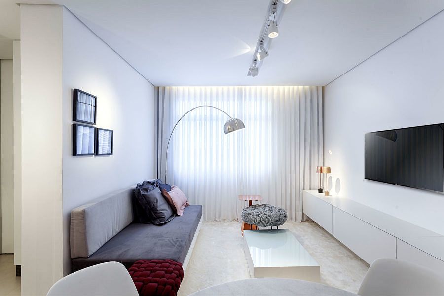 O branco se tornou aliado no alongamento dos ambientes, inclusive na utilização das marcenarias e móveis, pois tanto o aparador, tapete, cortina, mesa e cadeiras se mantêm branquinhos, o que não deixa o espaço sem graça, já que por pequenos adornos ou móveis, e até mesmo pelo piso de madeira, temos pontos de cor no apartamento.