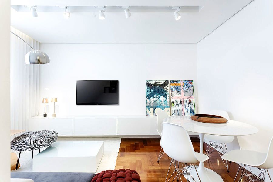 O branco se tornou aliado no alongamento dos ambientes, inclusive na utilização das marcenarias e móveis, pois tanto o aparador, tapete, cortina, mesa e cadeiras se mantêm branquinhos, o que não deixa o espaço sem graça, já que por pequenos adornos ou móveis, e até mesmo pelo piso de madeira, temos pontos de cor no apartamento.