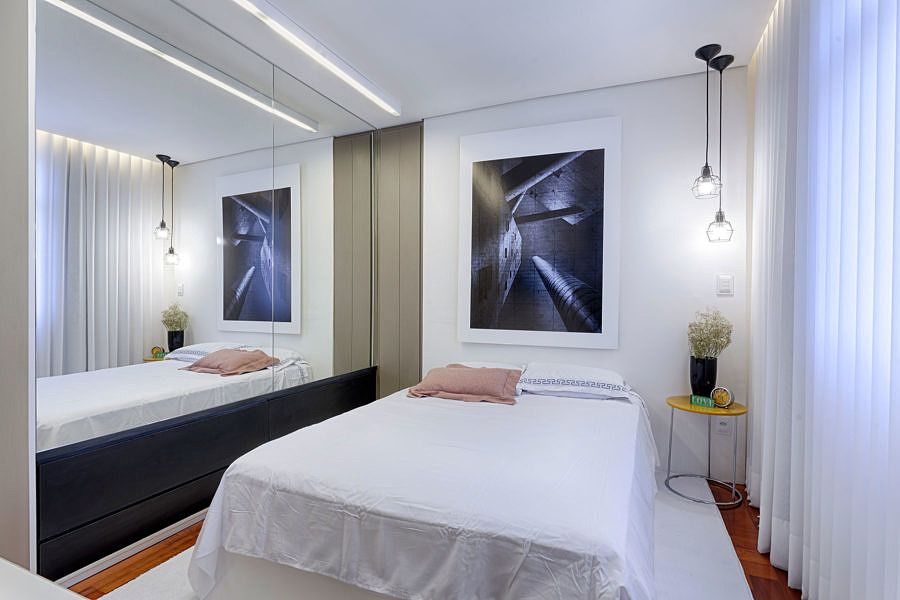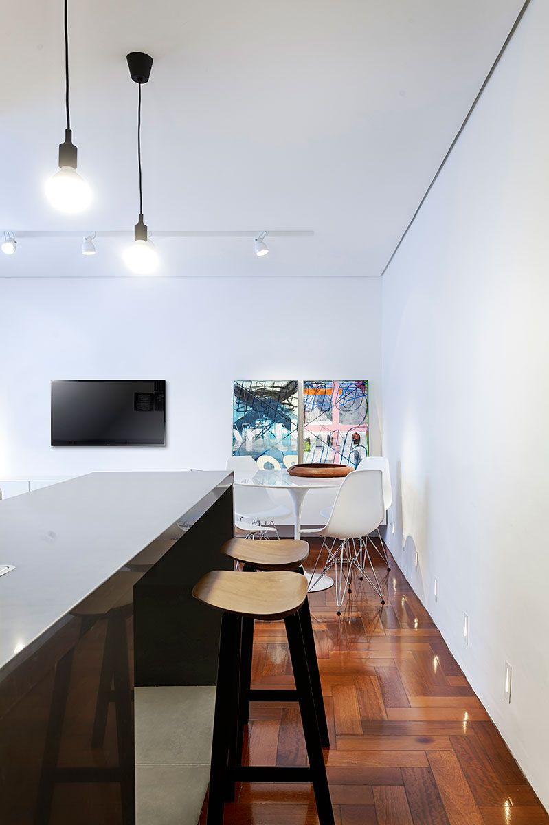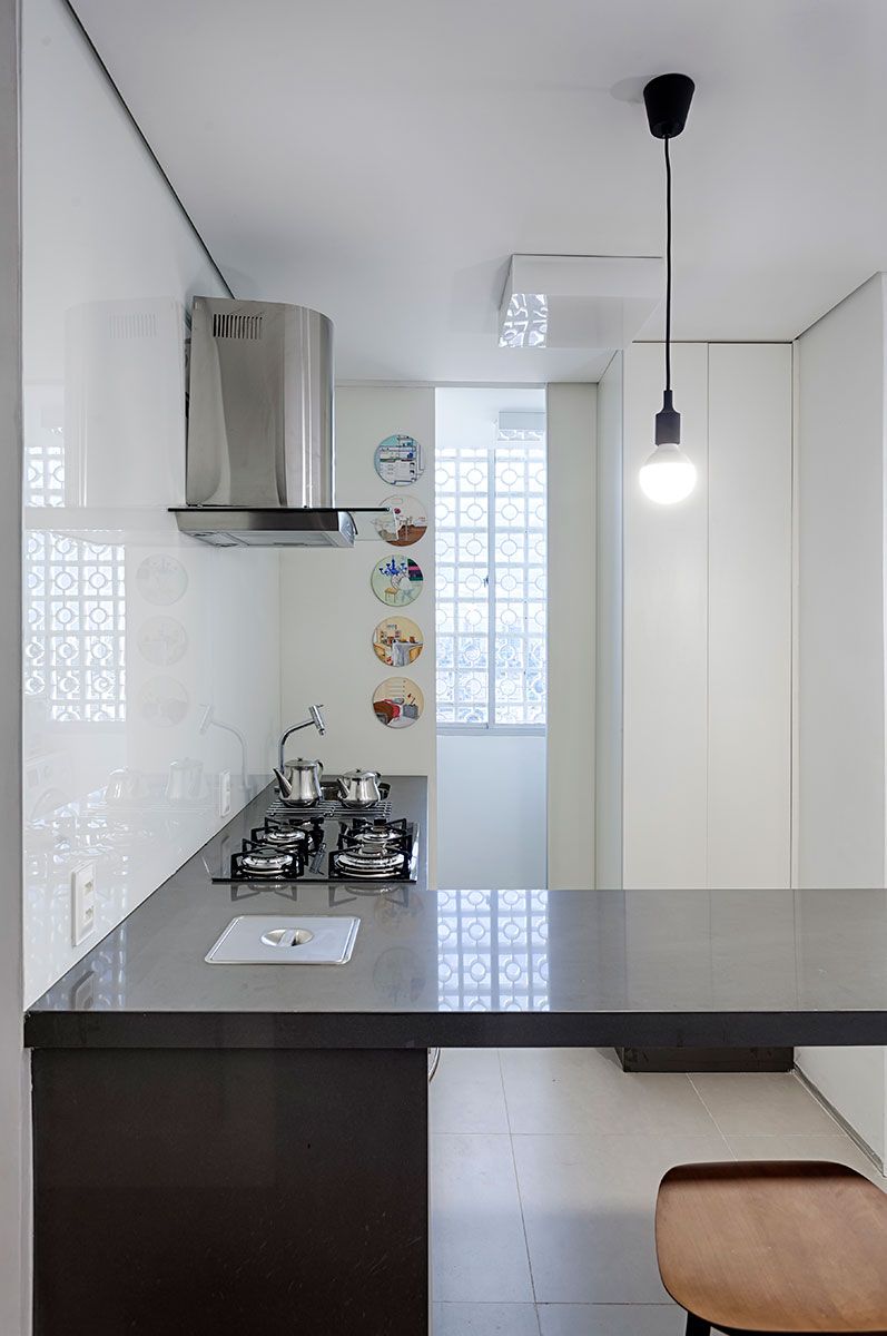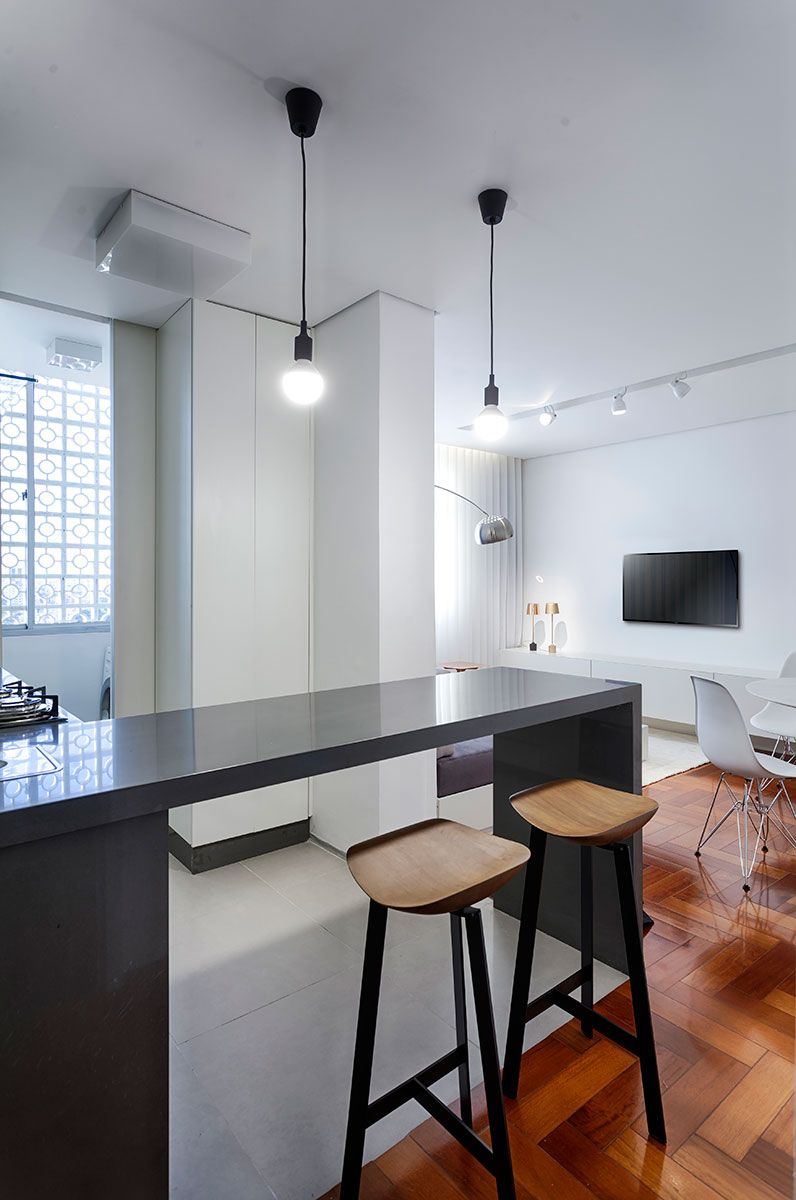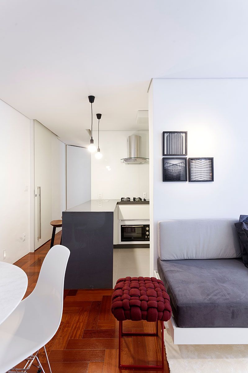 O cliente do escritório Piacesi Arquitetos Associados queria dar a sensação de amplitude ao apartamento de 40 m² e ainda ter um banheiro para as visitas. Um dos primeiros passos dos profissionais foi a abertura da cozinha, que ajudou na amplitude desse espaço e diminuiu o tamanho do corredor, que quase sempre pode ser considerada uma área “perdida” e deu a ele função junto a bancada e banquetinhas.