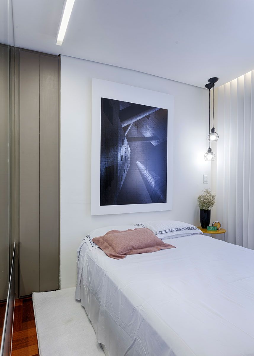 O maior desafio desse projeto para o escritório foi equilibrar visualmente e funcionalmente o tamanho dos ambientes, originalmente a sala e o quarto possuem a mesma metragem e funcionalmente são diferentes. As áreas molhadas são localizadas bem ao meio do apartamento que setoriza o apartamento em dois polos distintos, o que dificulta a integração dos ambientes.