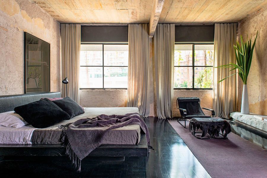 Na sala, grandes quadros contrastam com a parede descascada dando mais charme ao ambiente, que se completa com o sofá roxo e os demais itens em tons escuros. No quarto, a luz natural, que entra através das grandes janelas, deixa o ambiente acolhedor.