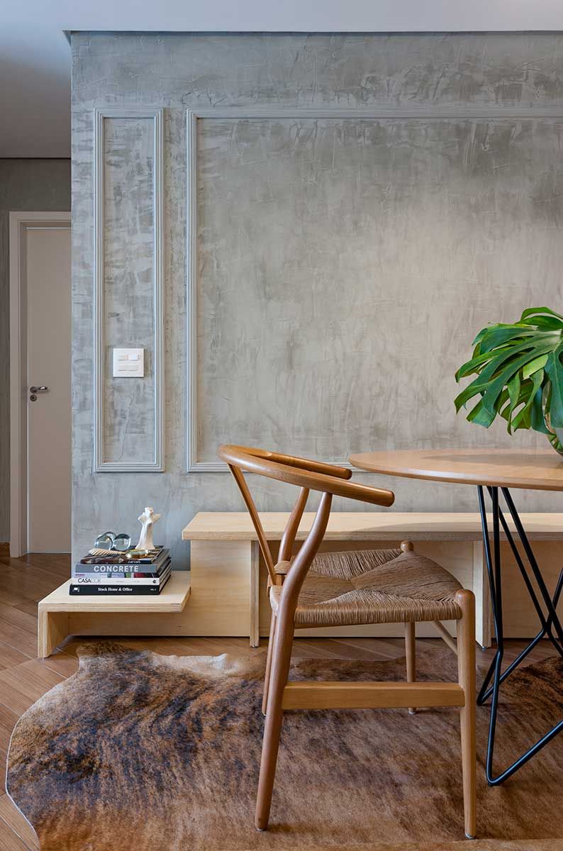 As linhas puras dos móveis foram valorizadas e acabamentos que remetem ao estilo industrial utilizados, como: pintura com efeito concreto, base da mesa jantar em aço e banco com acabamento rústico.