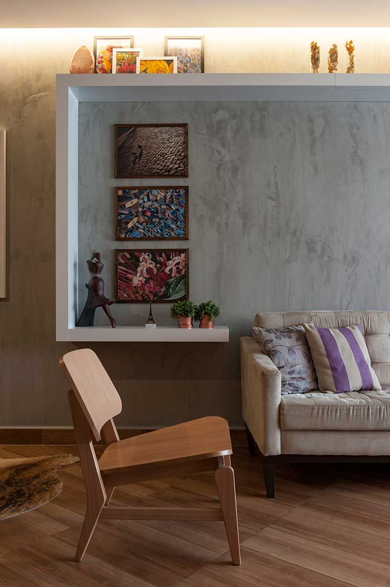 Fotos de viagens clicadas pela própria cliente em alta qualidade foram impressas e viraram quadros, que foram espalhados pelo ambiente. Há também um quadro de rolhas na adega, já que o casal aprecia um bom vinho, e algumas recordações que acabaram sendo adicionadas como objetos de decoração.