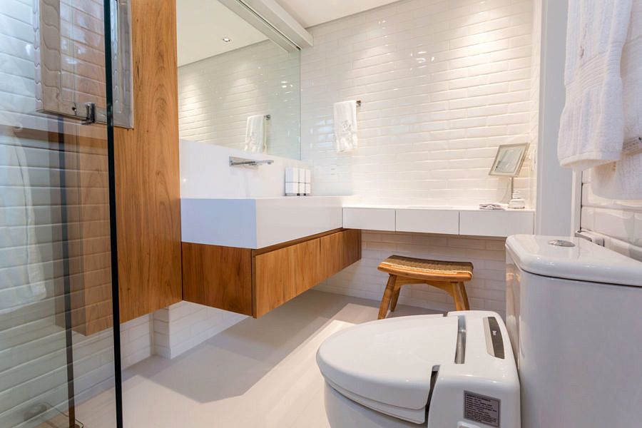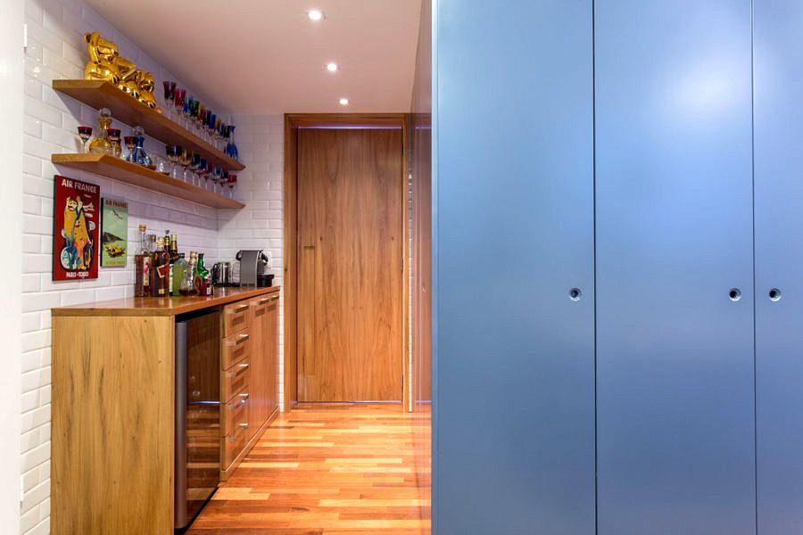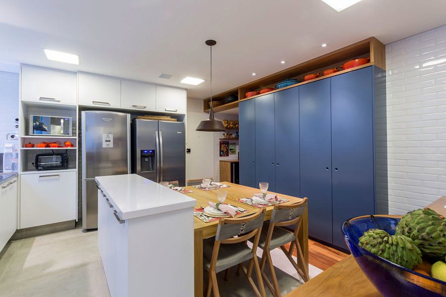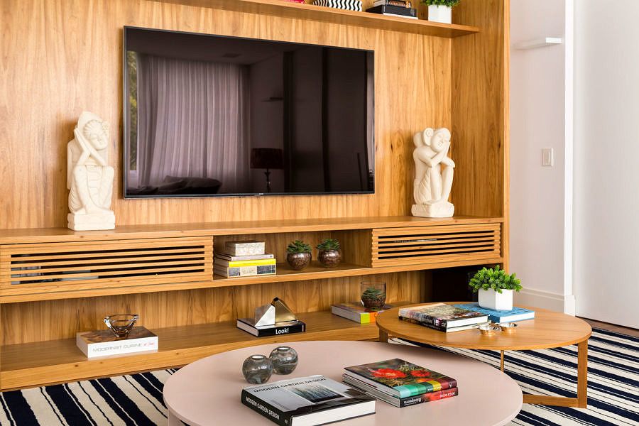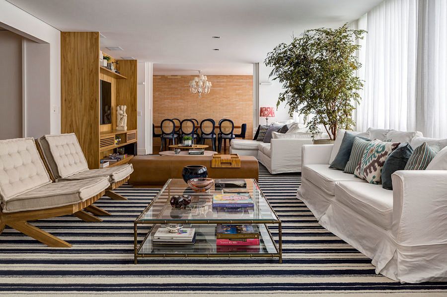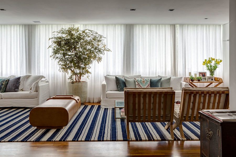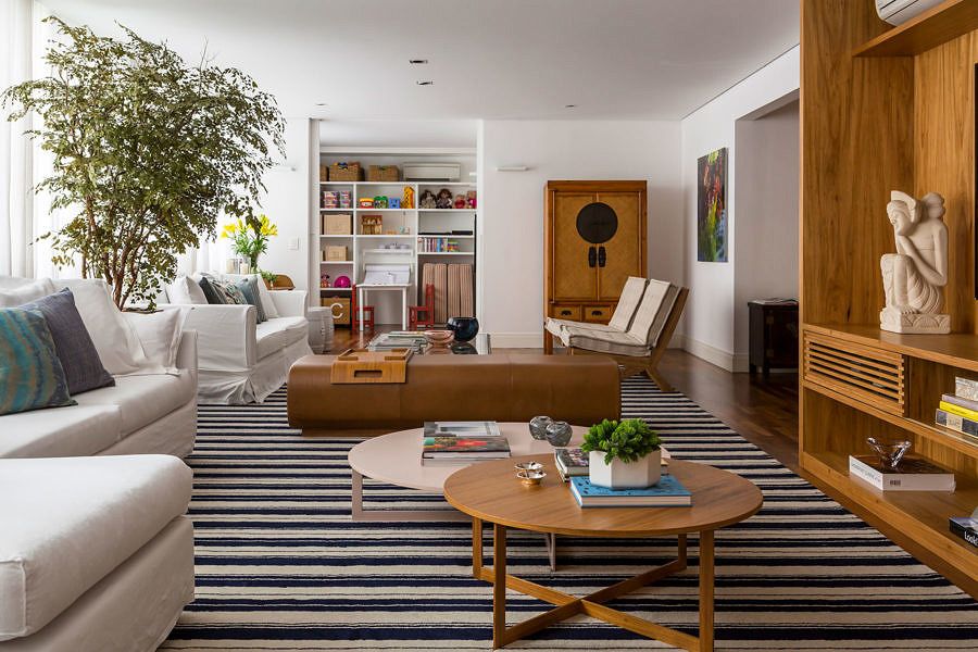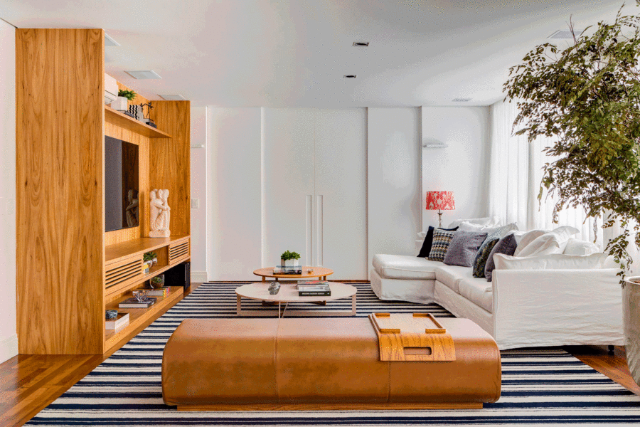 O uso da madeira em quase todos os ambientes, junto com a laca branca, trouxe uma base neutra e aconchegante aos ambientes. As cores foram aparecendo em detalhes da decoração, como o grande tapete listrado branco e azul marinho da sala, a escrivaninha do escritório em verde esmaecido, mesa de centro redonda rosa antigo, almofadas, quadros e fotos.
