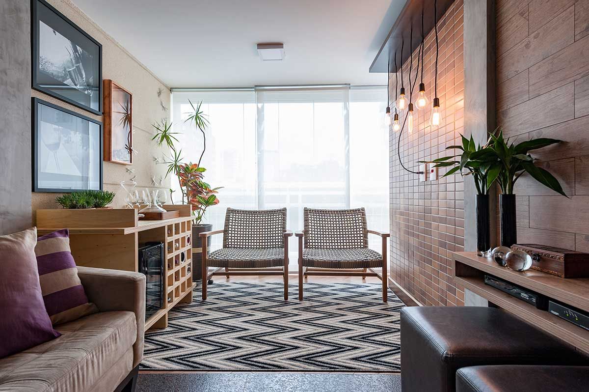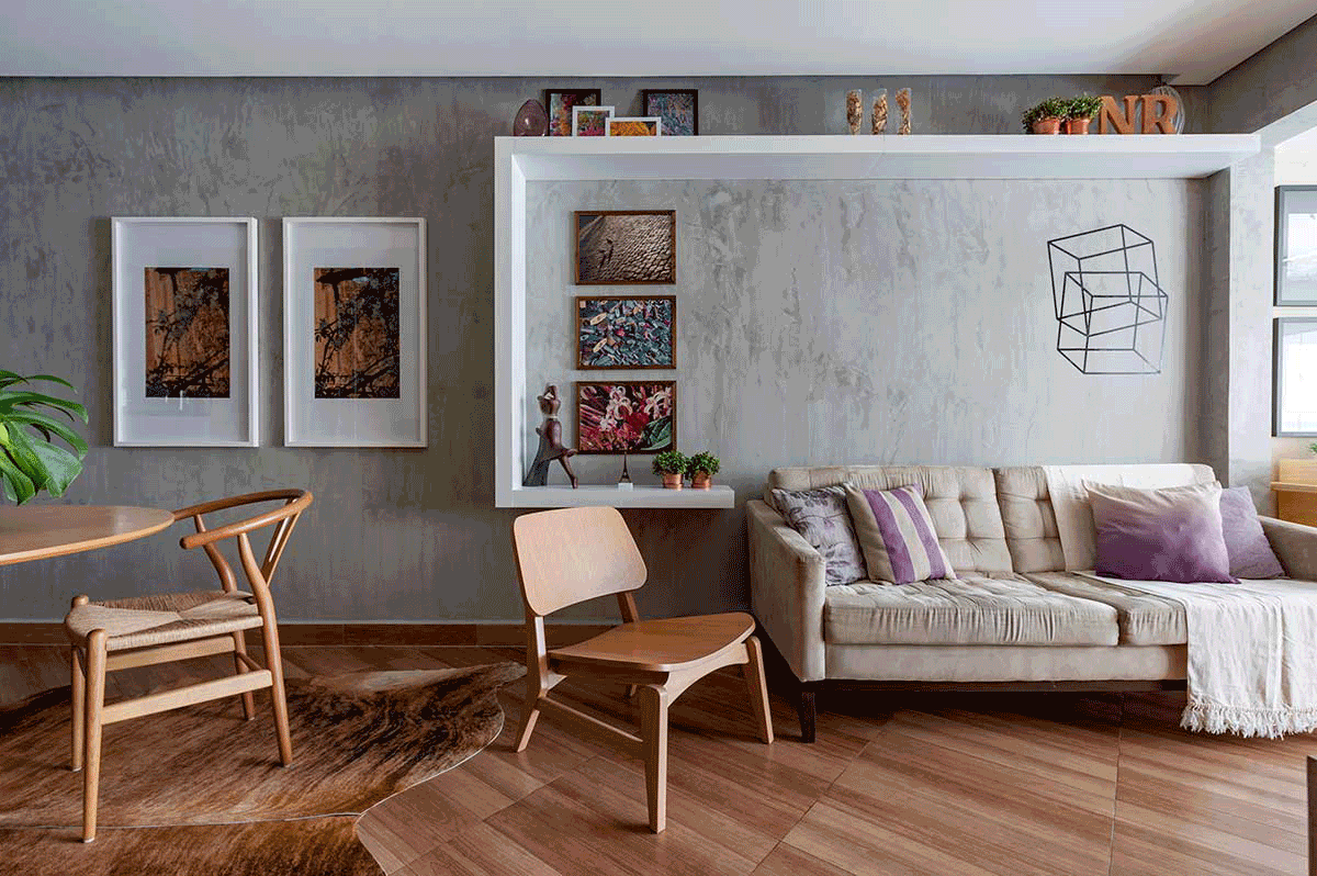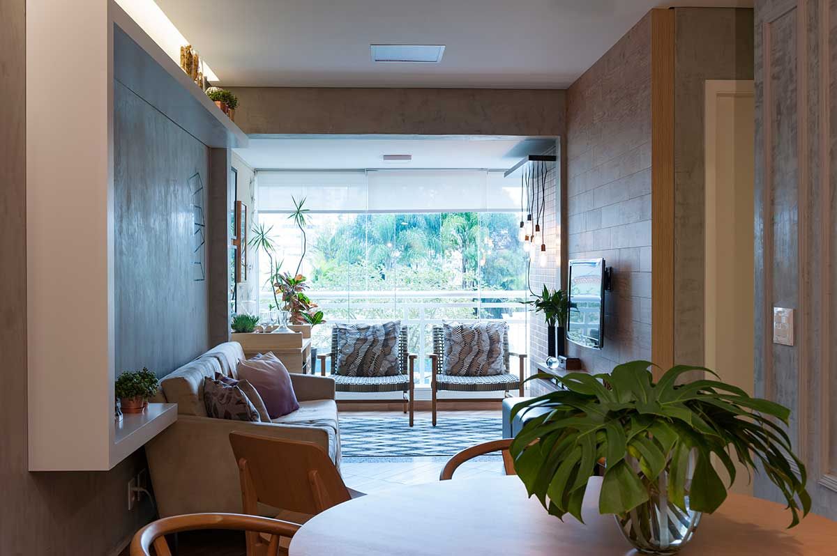 O ponto alto do projeto foi a integração de três ambientes, que antes eram divididos, a sala de jantar, estar e a varanda. Totalizando 25 m², a varanda foi integrada à sala para acomodar amigos e familiares nas frequentes reuniões.
