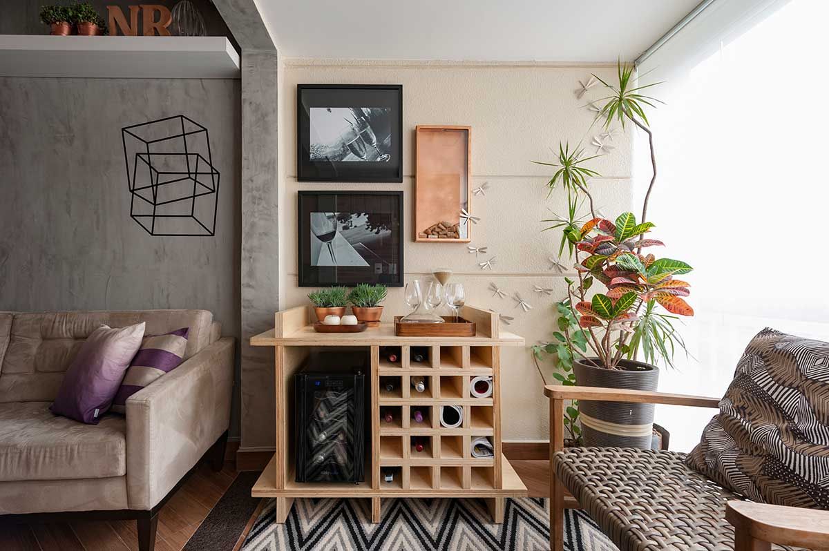 Fotos de viagens clicadas pela própria cliente em alta qualidade foram impressas e viraram quadros, que foram espalhados pelo ambiente. Há também um quadro de rolhas na adega, já que o casal aprecia um bom vinho, e algumas recordações que acabaram sendo adicionadas como objetos de decoração.