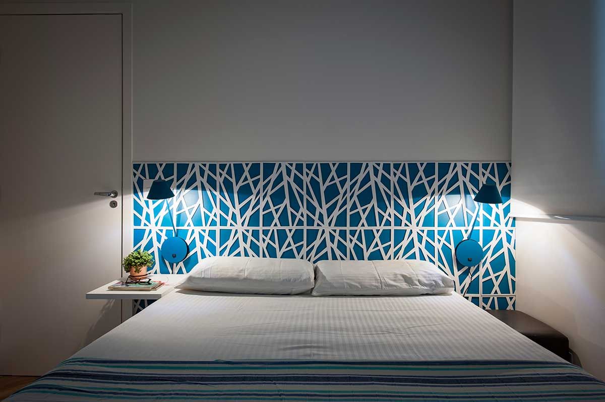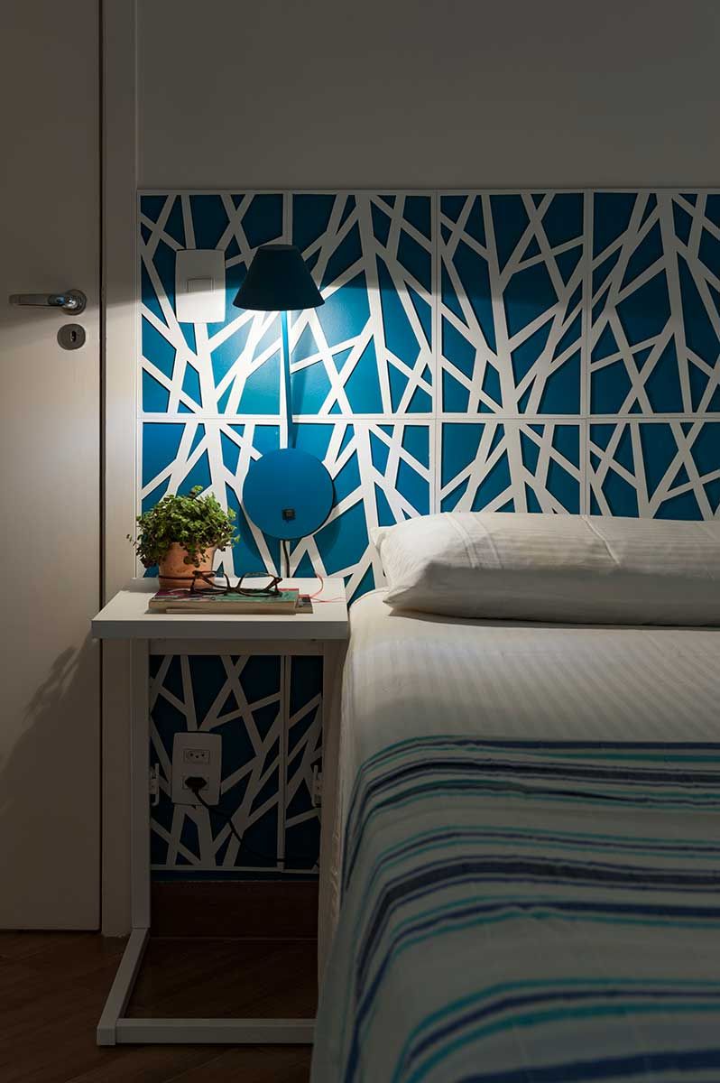 Sem o nicho do armário foi possível reposicionar a cama, com destaque para pintura da cabeceira. O resultado foi um quarto minimalista e que atende as necessidades e desejos do casal.