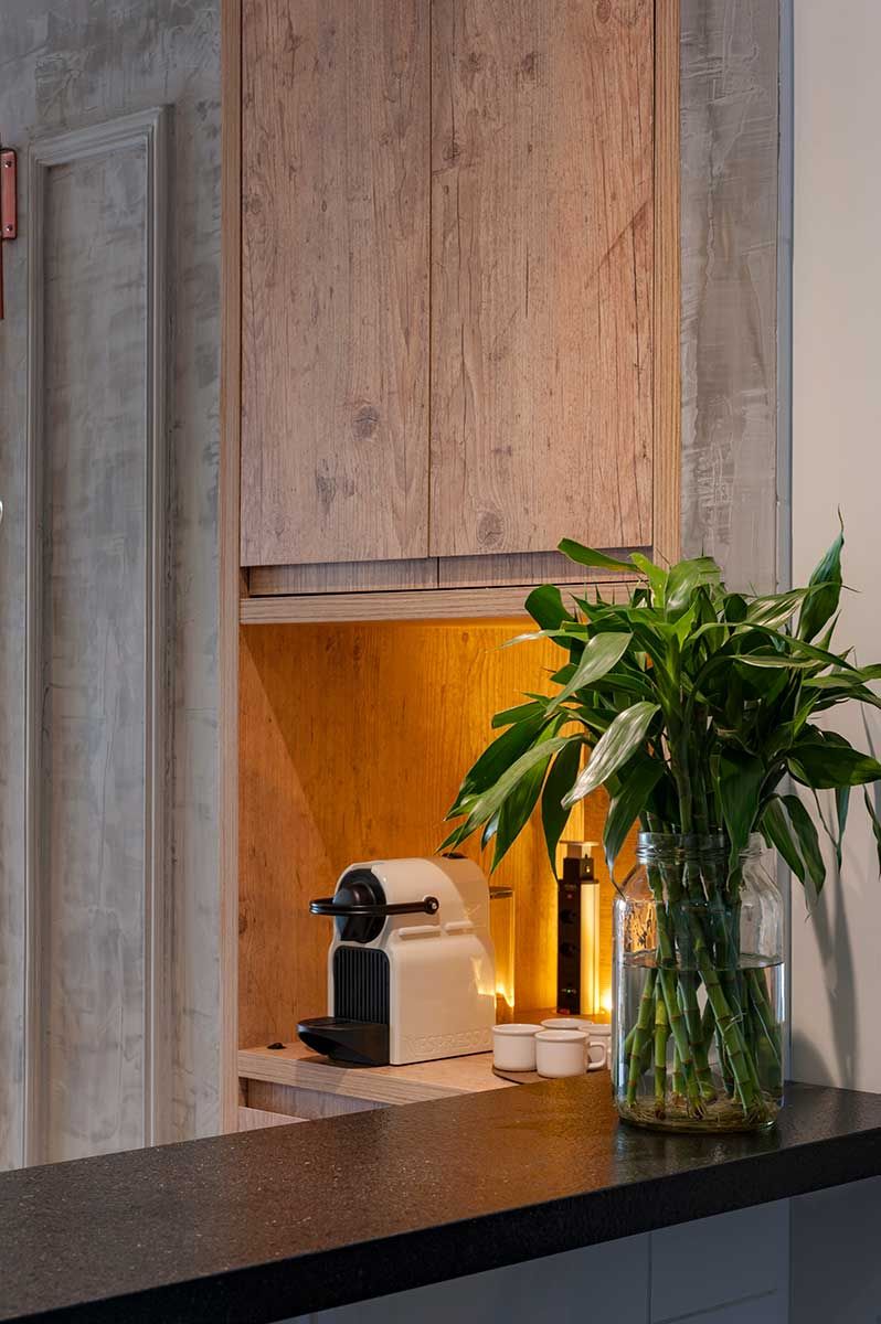 A cozinha americana permaneceu com formato entregue pela construtora, os profissionais apenas modernizaram os utensílios e trocaram os revestimentos, banquetas e balcão.