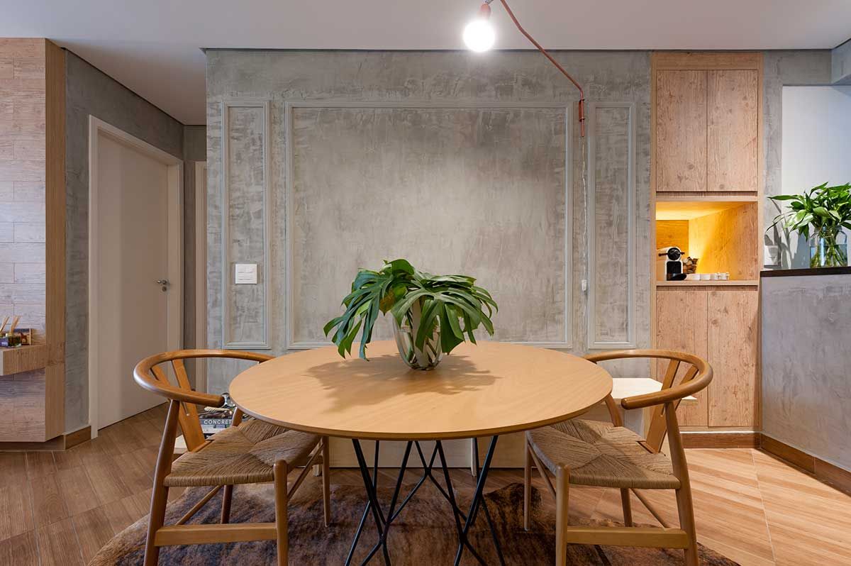 As linhas puras dos móveis foram valorizadas e acabamentos que remetem ao estilo industrial utilizados, como: pintura com efeito concreto, base da mesa jantar em aço e banco com acabamento rústico.