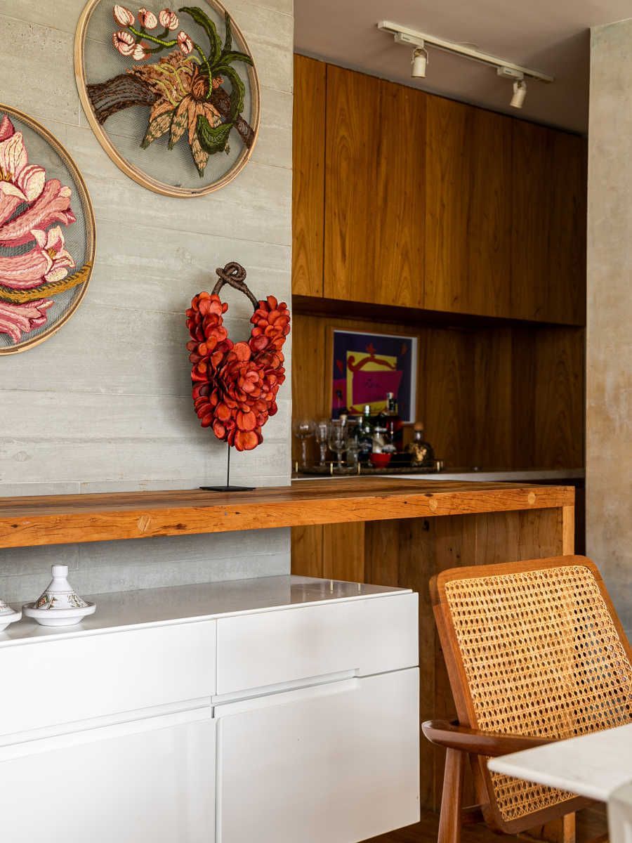 Os revestimentos são outro destaque do projeto. O painel da TV, desenvolvido pela Marcenaria Renara com acabamento em freijó, não inclui nenhum móvel para facilitar a circulação. Na sala de jantar, a parede é vestida com uma pintura da artista Thais Peres. O quarto das crianças foi revestido com papel de parede Bucalo, enquanto o banheiro conta com peças de cerâmica da Mais Revestimentos que trazem um visual retrô.