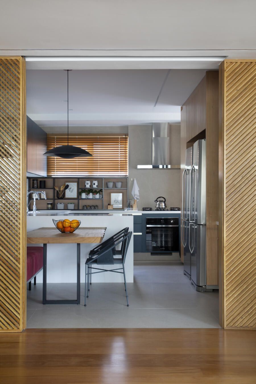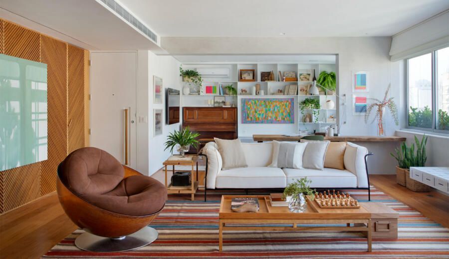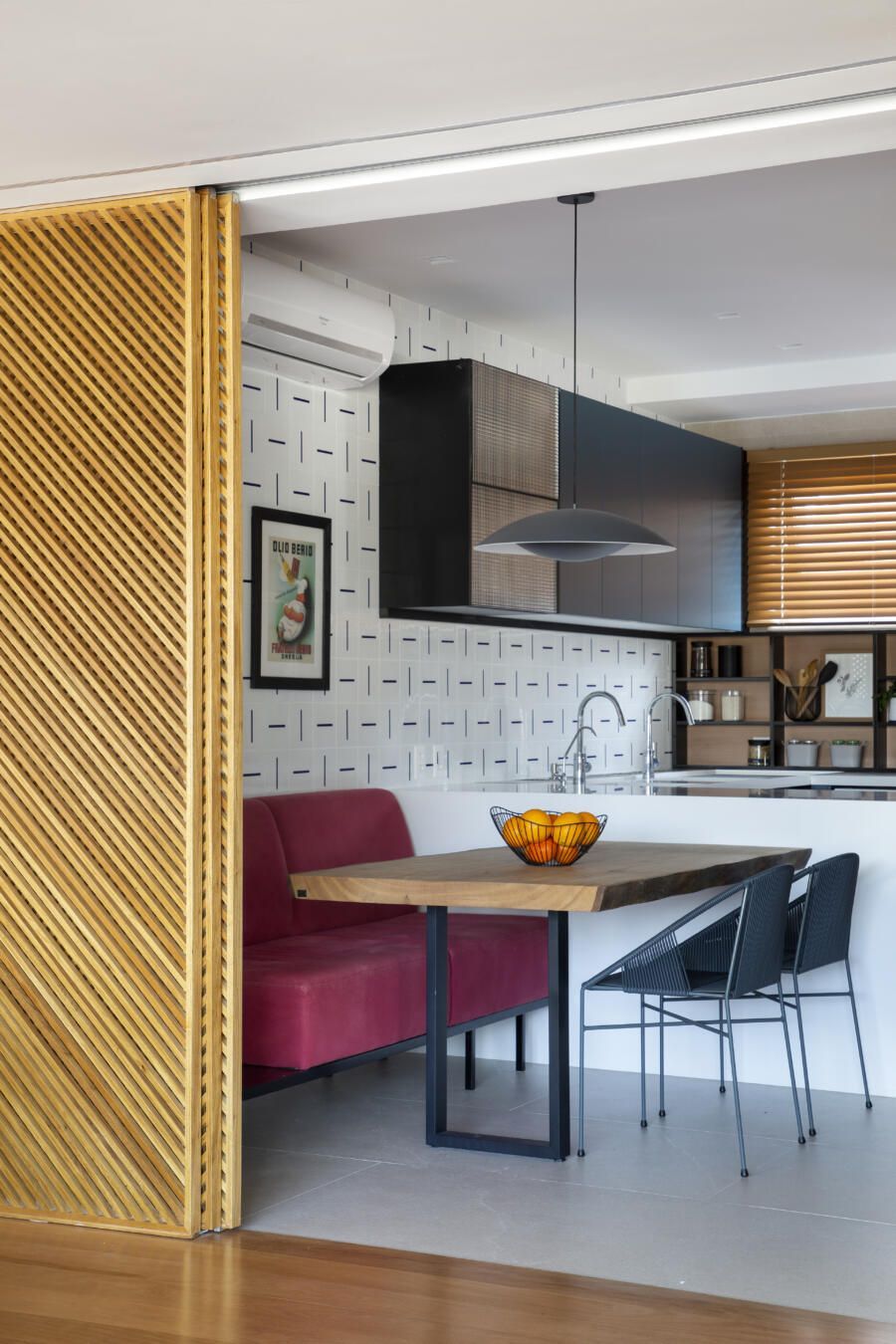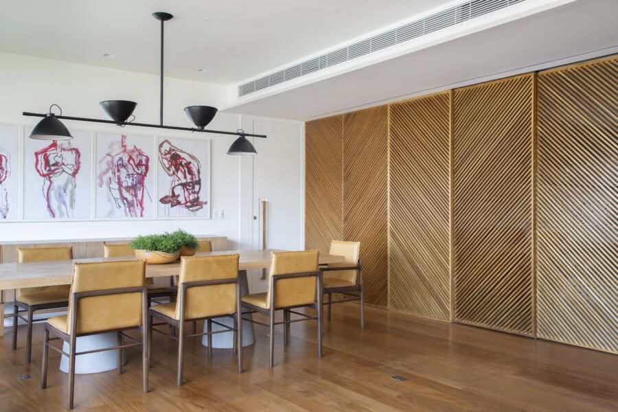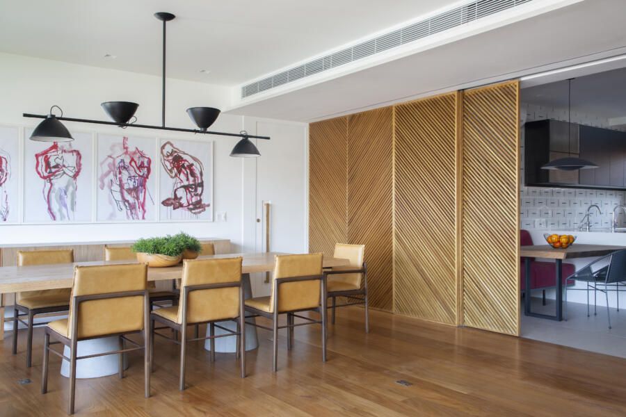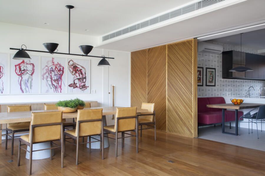 “O banco em alvenaria revestido em azulejos, que fica logo abaixo da janela talvez seja um dos grandes objetos que saltam aos olhos no apartamento. Vale ressaltar também o painel, que ocupa toda a parede voltada para a sala. No total, são dez folhas de painel ripadas em freijó, sendo que três delas se abrem para a cozinha e para a copa, permitindo uma total integração com as salas. E ainda, uma delas esconde propositalmente o lavabo do apartamento.”