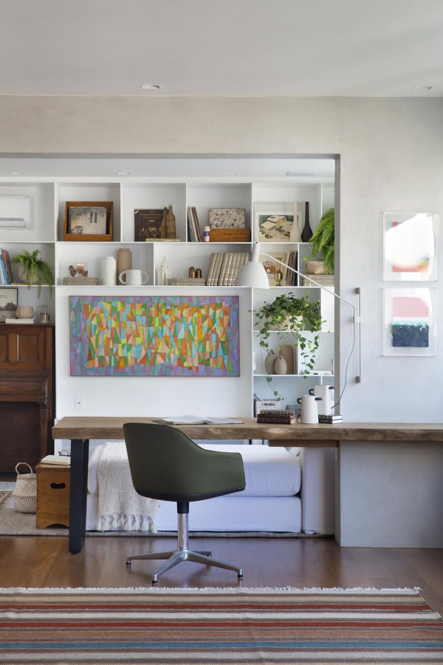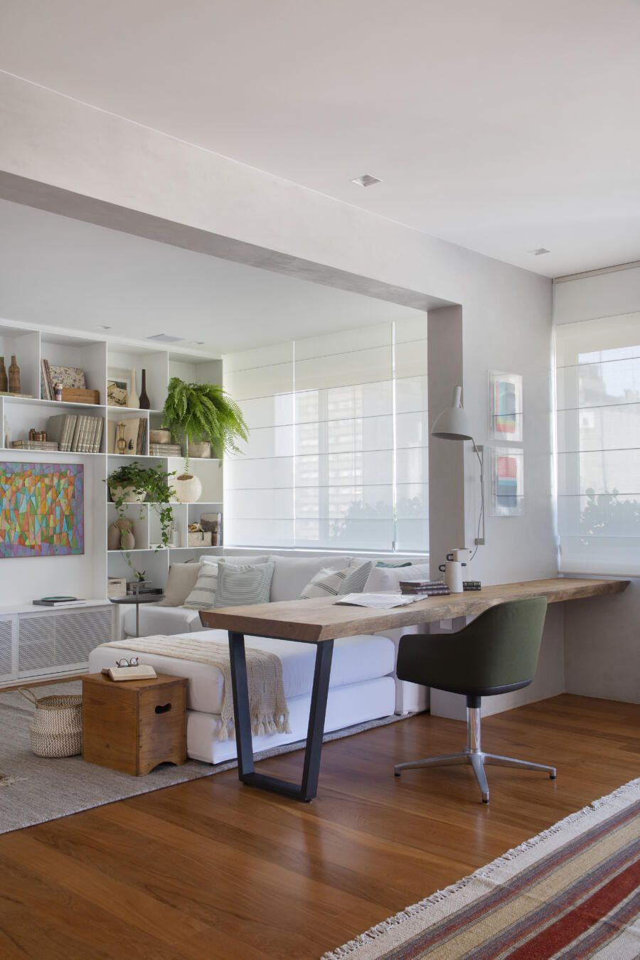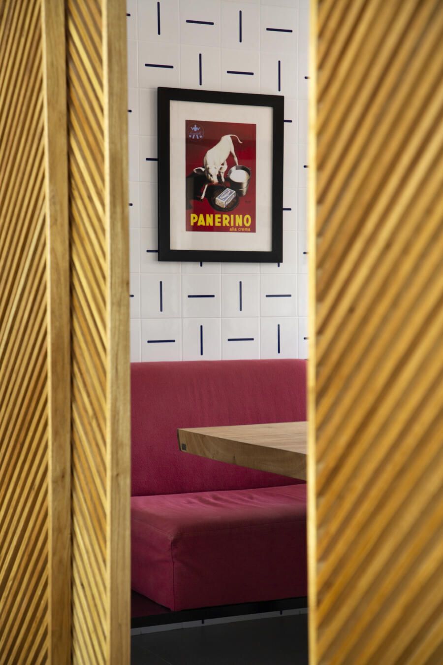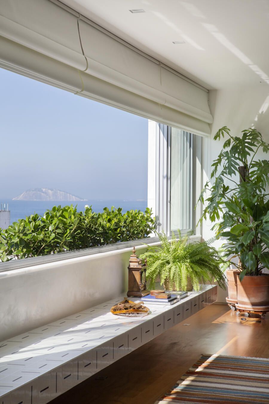 “O banco em alvenaria revestido em azulejos, que fica logo abaixo da janela talvez seja um dos grandes objetos que saltam aos olhos no apartamento. Vale ressaltar também o painel, que ocupa toda a parede voltada para a sala. No total, são dez folhas de painel ripadas em freijó, sendo que três delas se abrem para a cozinha e para a copa, permitindo uma total integração com as salas. E ainda, uma delas esconde propositalmente o lavabo do apartamento.”
