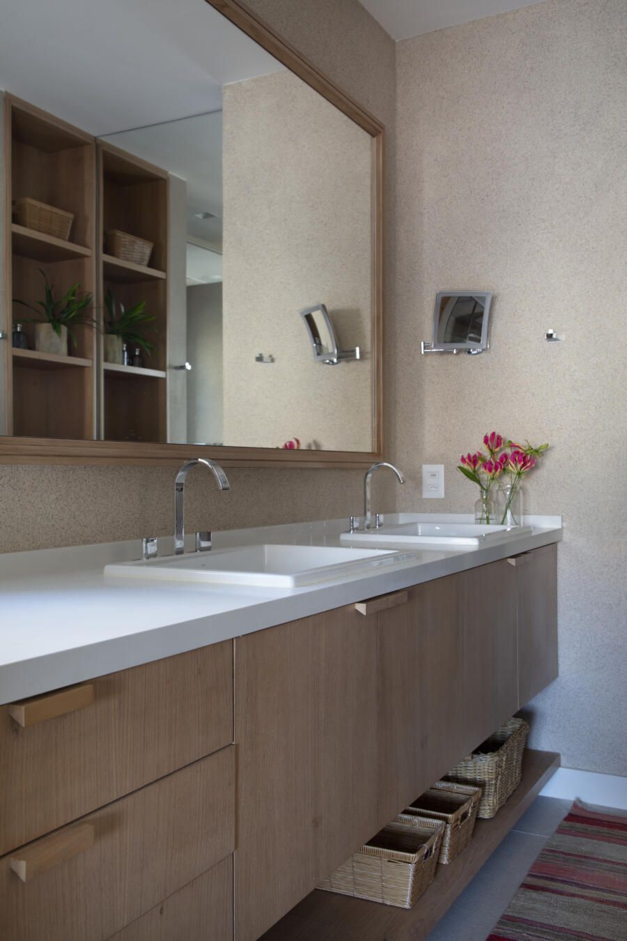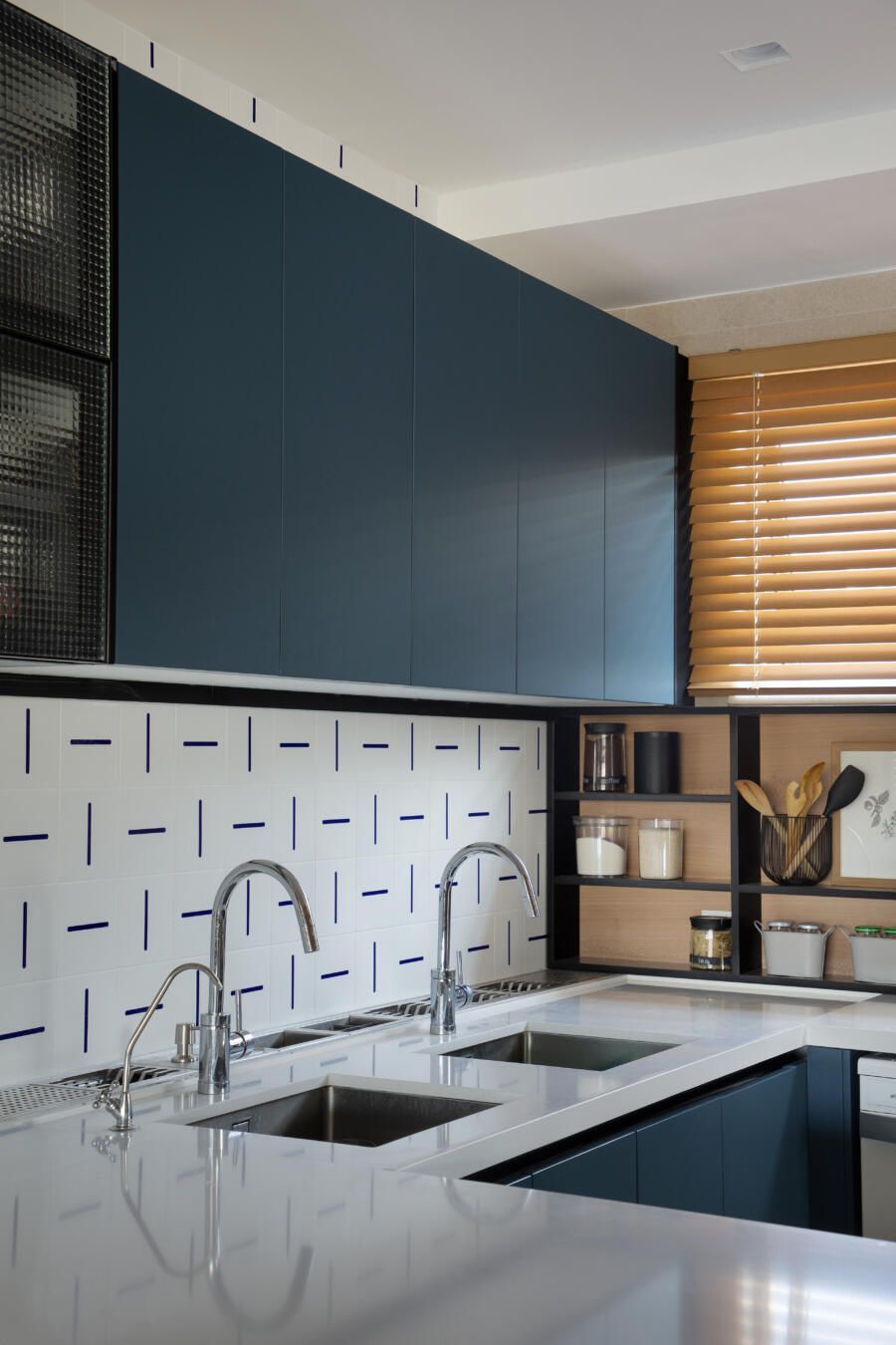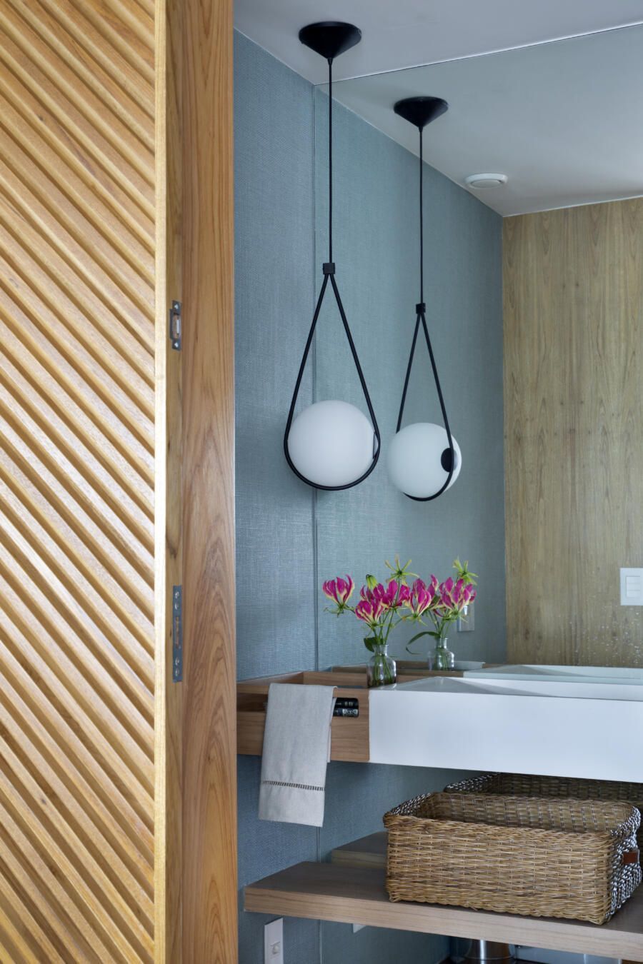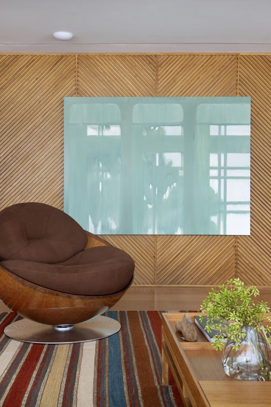 “O banco em alvenaria revestido em azulejos, que fica logo abaixo da janela talvez seja um dos grandes objetos que saltam aos olhos no apartamento. Vale ressaltar também o painel, que ocupa toda a parede voltada para a sala. No total, são dez folhas de painel ripadas em freijó, sendo que três delas se abrem para a cozinha e para a copa, permitindo uma total integração com as salas. E ainda, uma delas esconde propositalmente o lavabo do apartamento.”