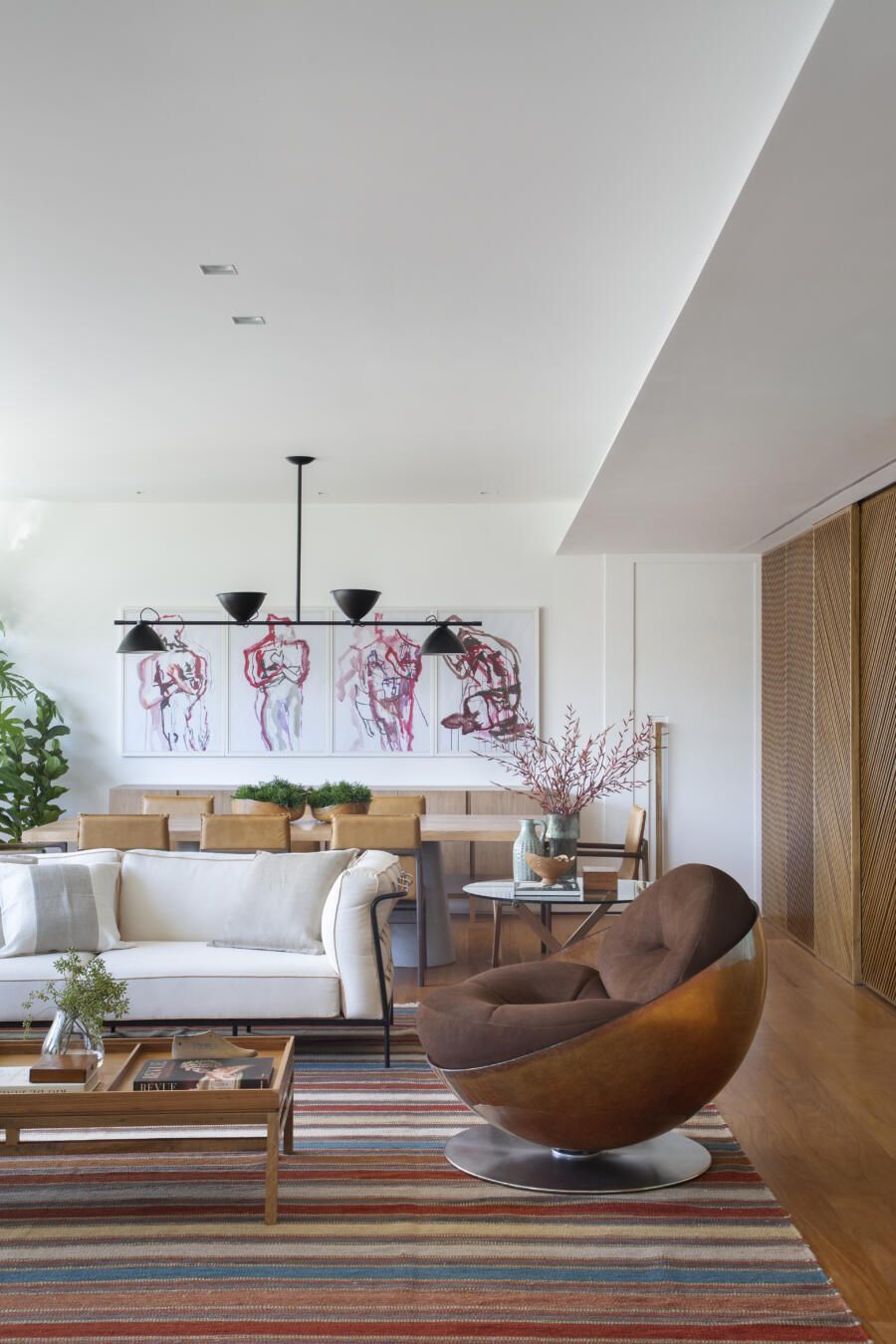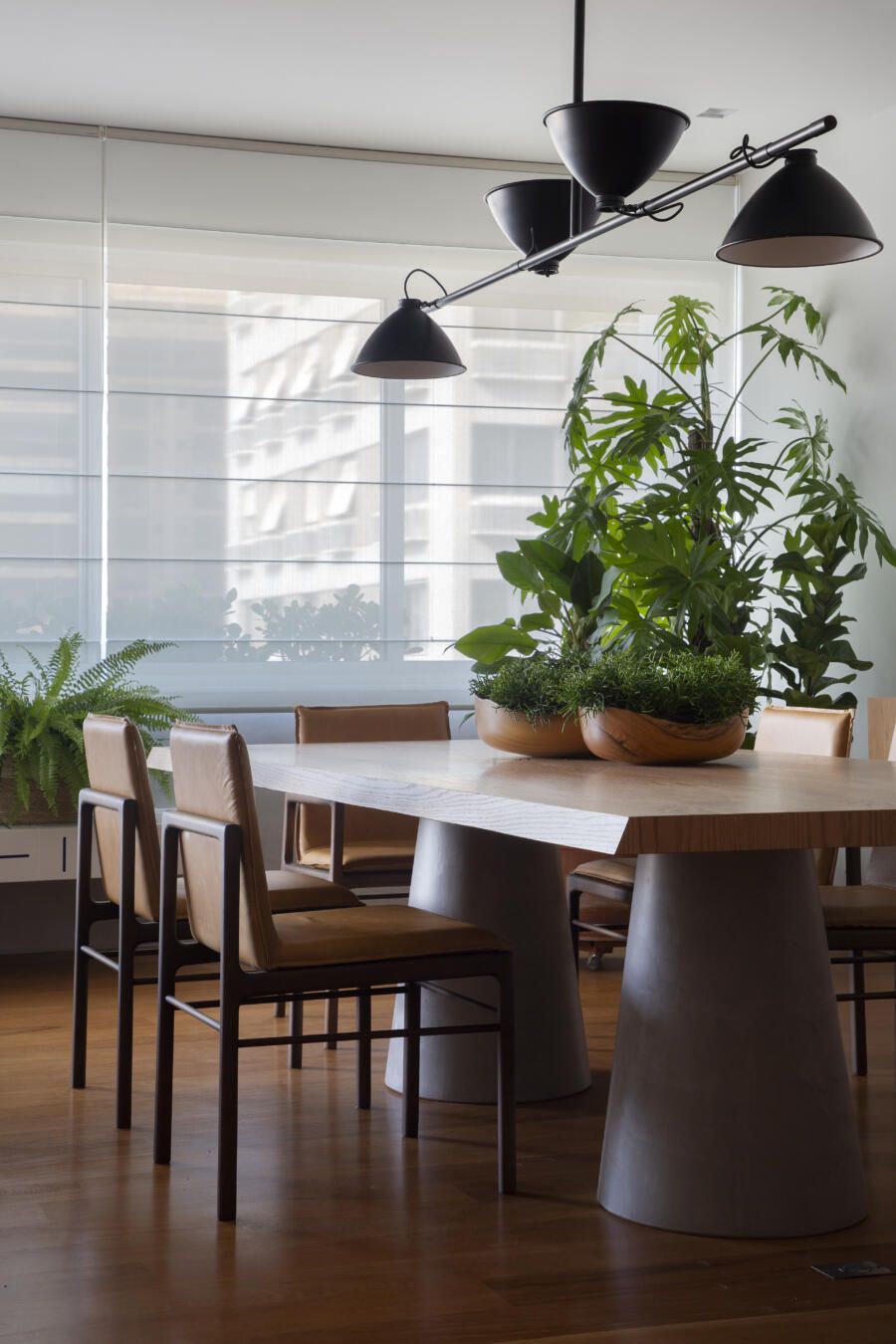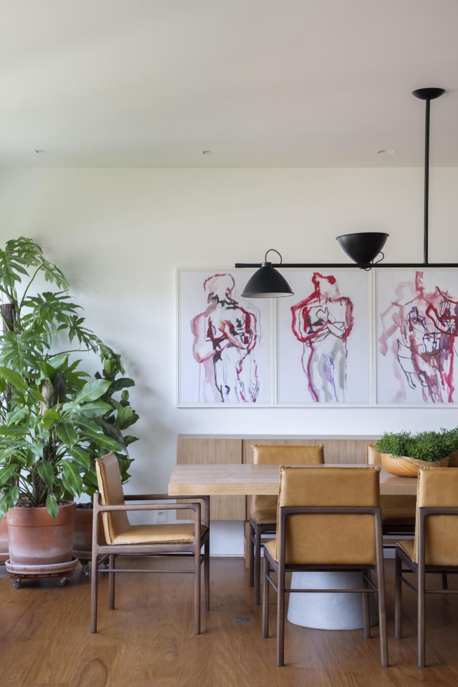 “A mesa de jantar em concreto e madeira cria um jogo de materiais e texturas com as cadeiras em couro caramelo. E a composição de quadros dos clientes junto com a luminária complementam a decoração e traduzem a personalidade deles no ambiente.”