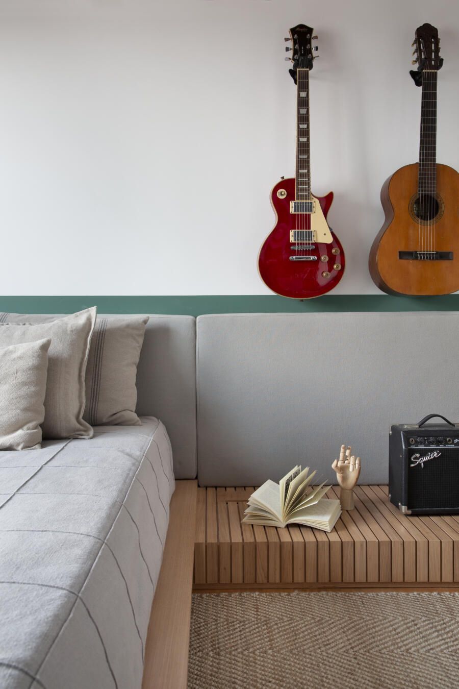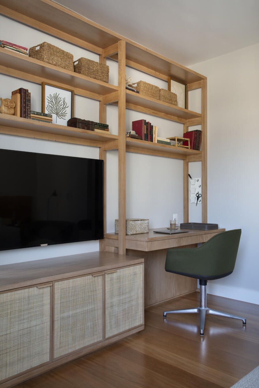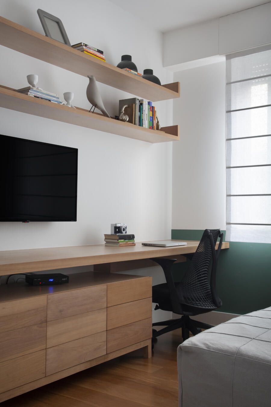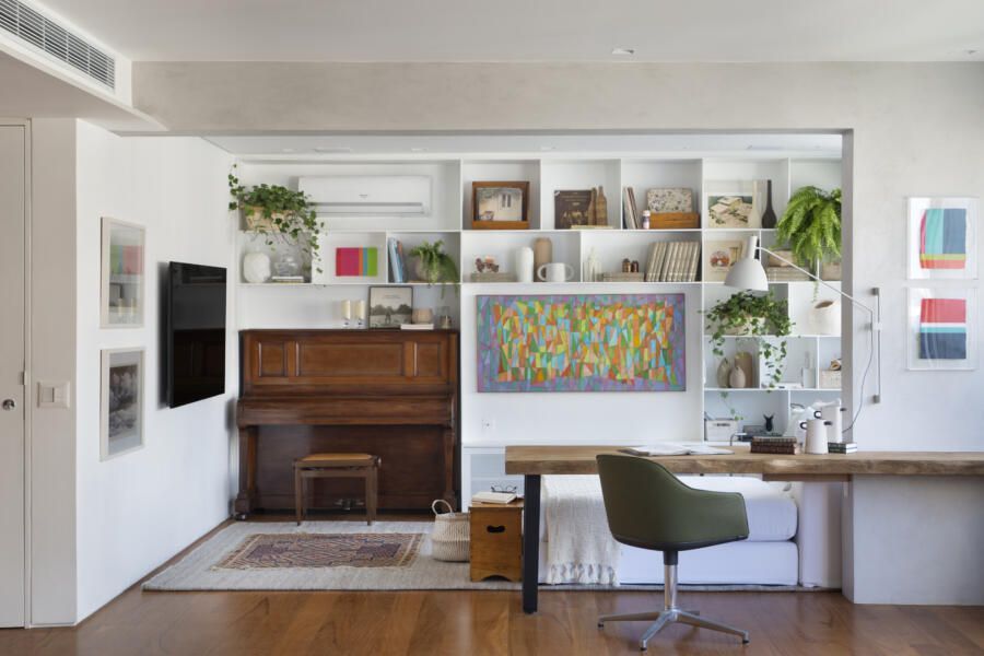 “A sala de TV conta muito a história da família através de um piano herdado. Nela, incluímos também um espaço para home office, mas sem deixar que isso tirasse a privacidade e o aconchego tão necessários para o ambiente.”